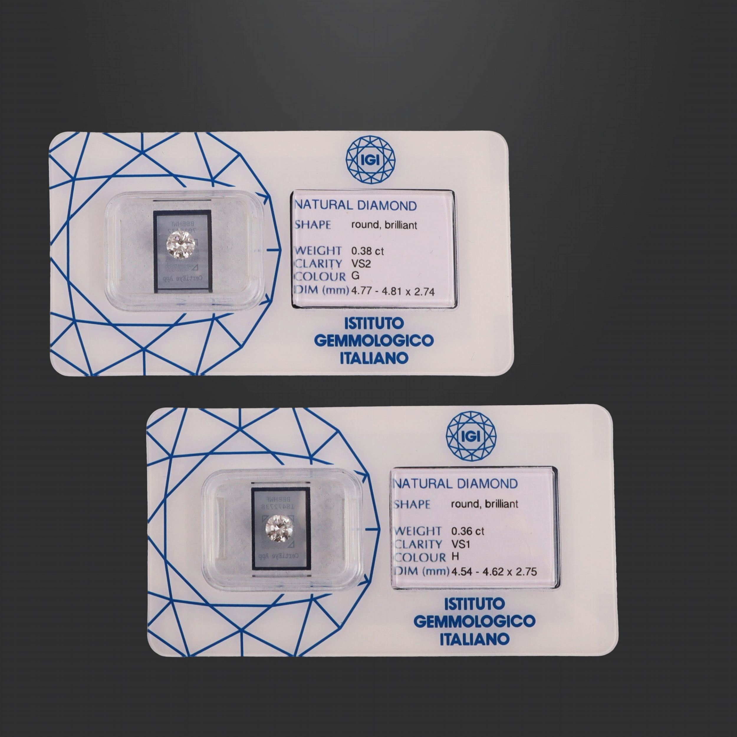 taglio a brillante del peso di 0,38 ct e 0,36 ct, privi di montatura. Analisi gemmologiche n. 56552 e 56551 del 23/02/2024 rilasciate dal laboratorio IGI di Milano