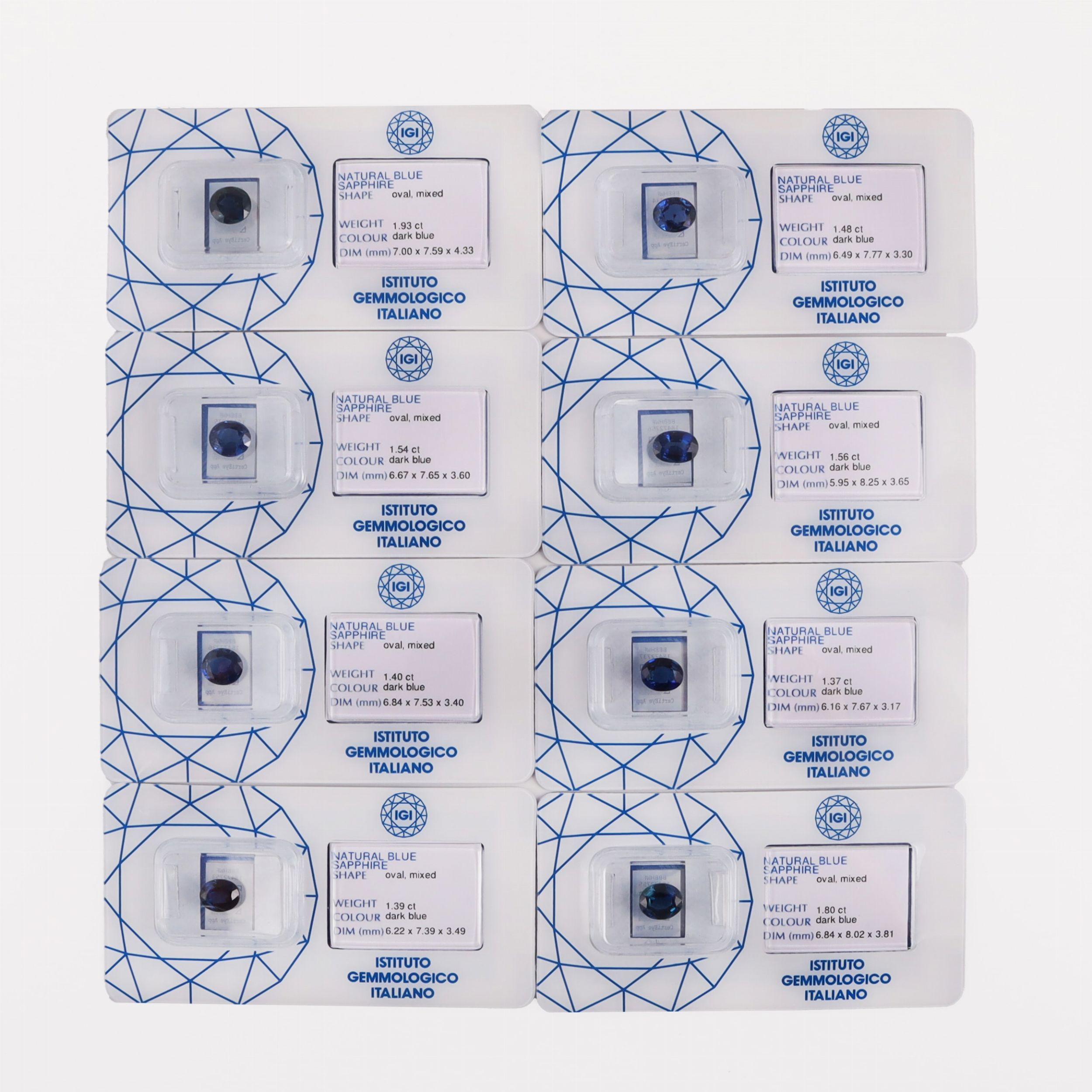 a forma ovale del peso di 1,93 ct, 1,80 ct, 1,56 ct, 1,54 ct, 1,48 ct, 1,40 ct, 1,39 ct, 1,37 ct, (peso complessivo 12,47 ct), privi di montatura. Analisi gemmologiche n. 56560, n. 56559, n. 56558, n. 56557, n. 56556, n. 56554, n. 56555, n. 56553 rilasciate dal laboratorio IGI di Milano, attestanti che gli zaffiri hanno subito trattamento termico.