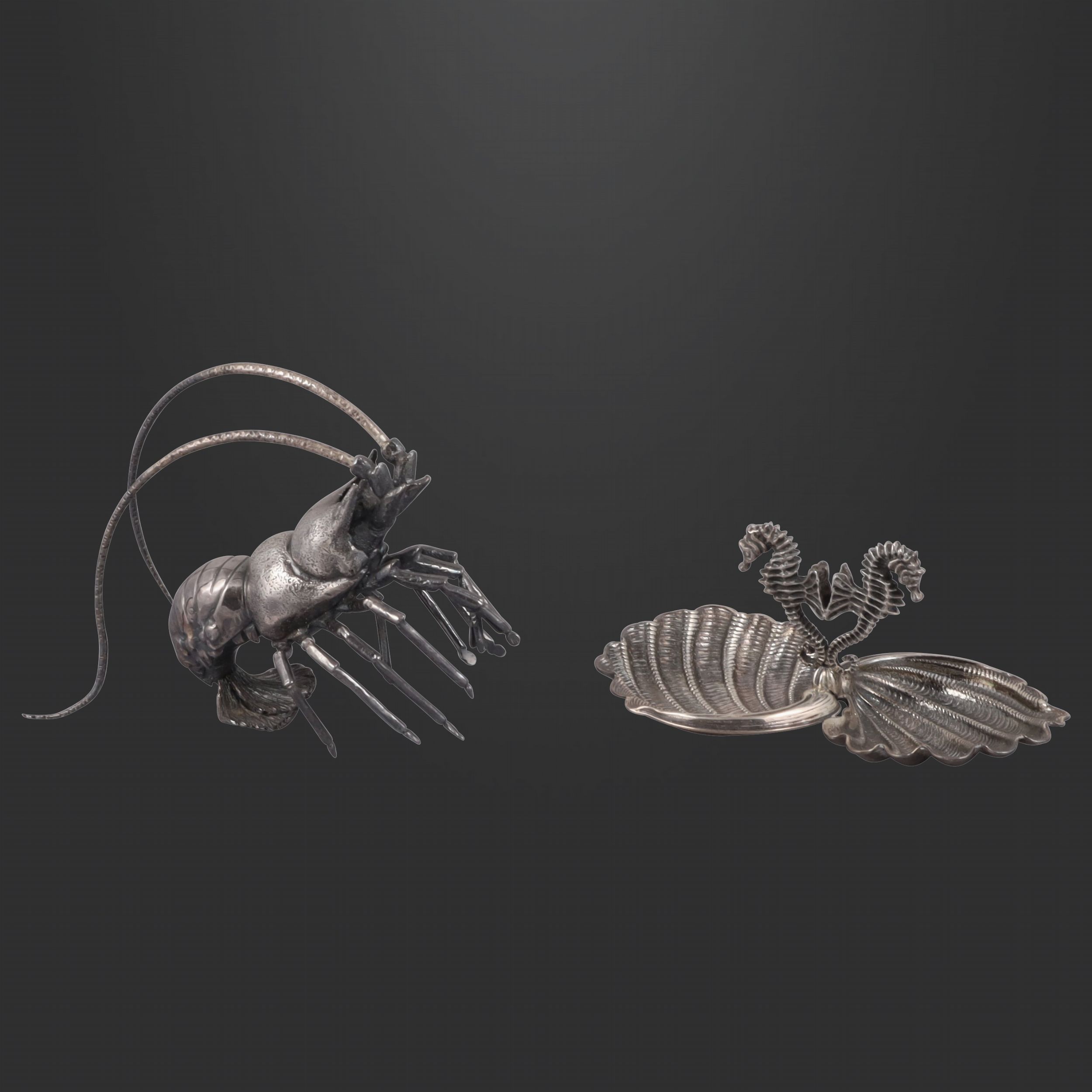 composto da oggetto decorativo raffigurante un'aragosta e segnaposto a guisa di conchiglie con cavallucci marini, realizzati in argento 925, gr. complessivi 95 ca. Corredati da custodie originali. Dimensioni aragosta 6,5 x 7 cm ca. Firmati: Gianmaria Buccellati