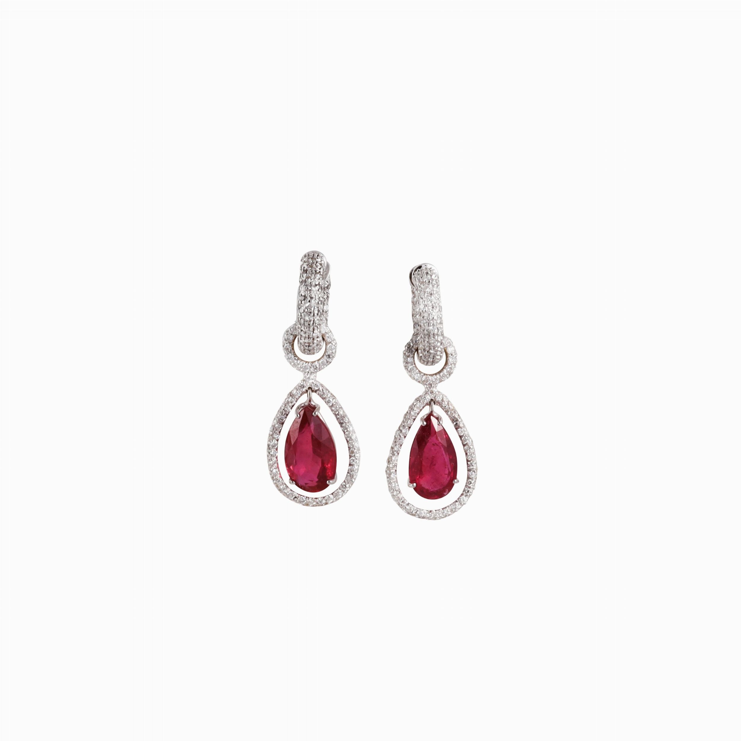 in oro bianco interamente ornati da brillanti del peso complessivo di 3,50 ct ca. con rubini a goccia sospesi del peso complessivo di 10 ct ca., gr. 12. Lunghezza 4 cm ca.