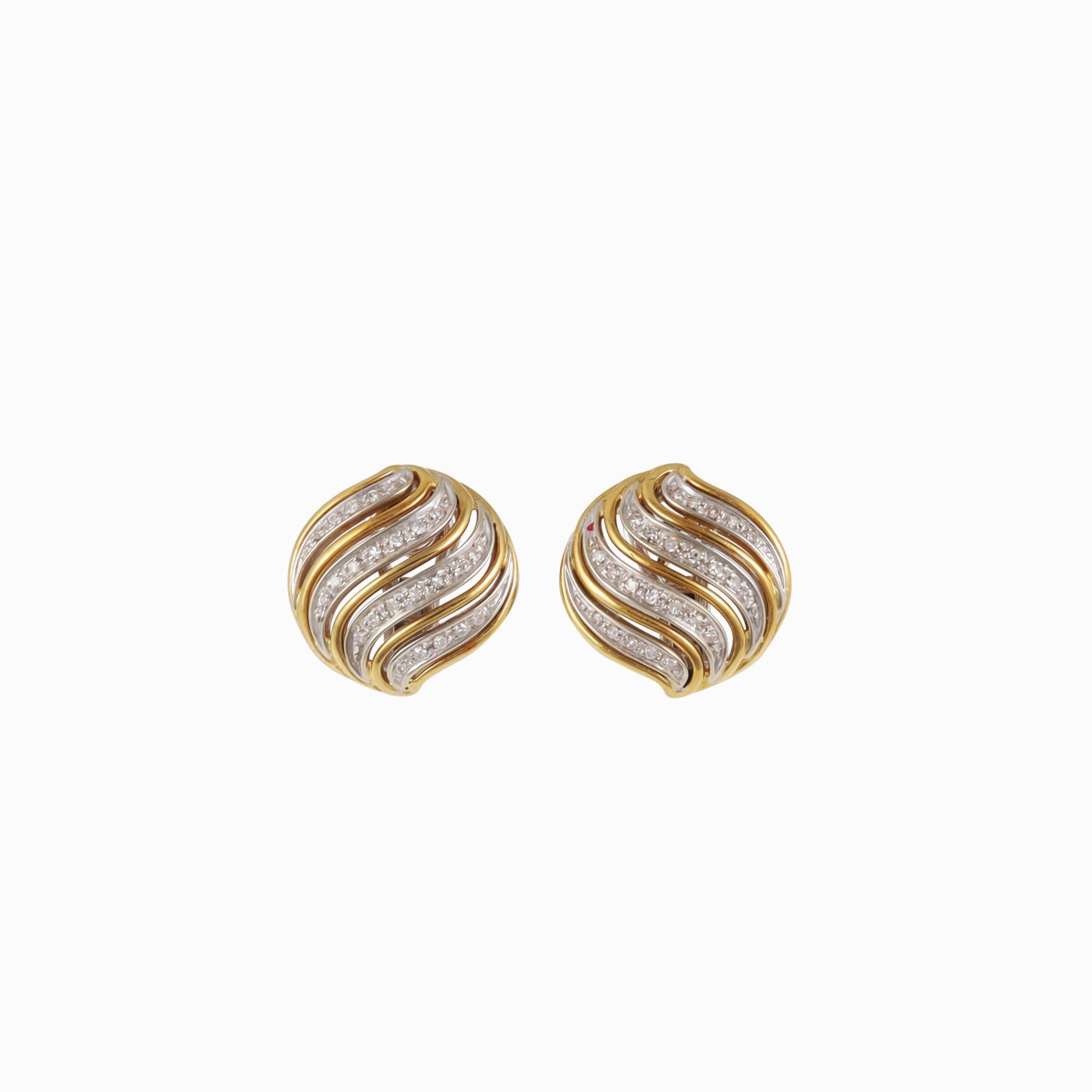 a forma circolare in oro giallo e bianco traforati a motivo ondulato con diamanti, gr. 12,5. Diametro 1,8 cm ca.