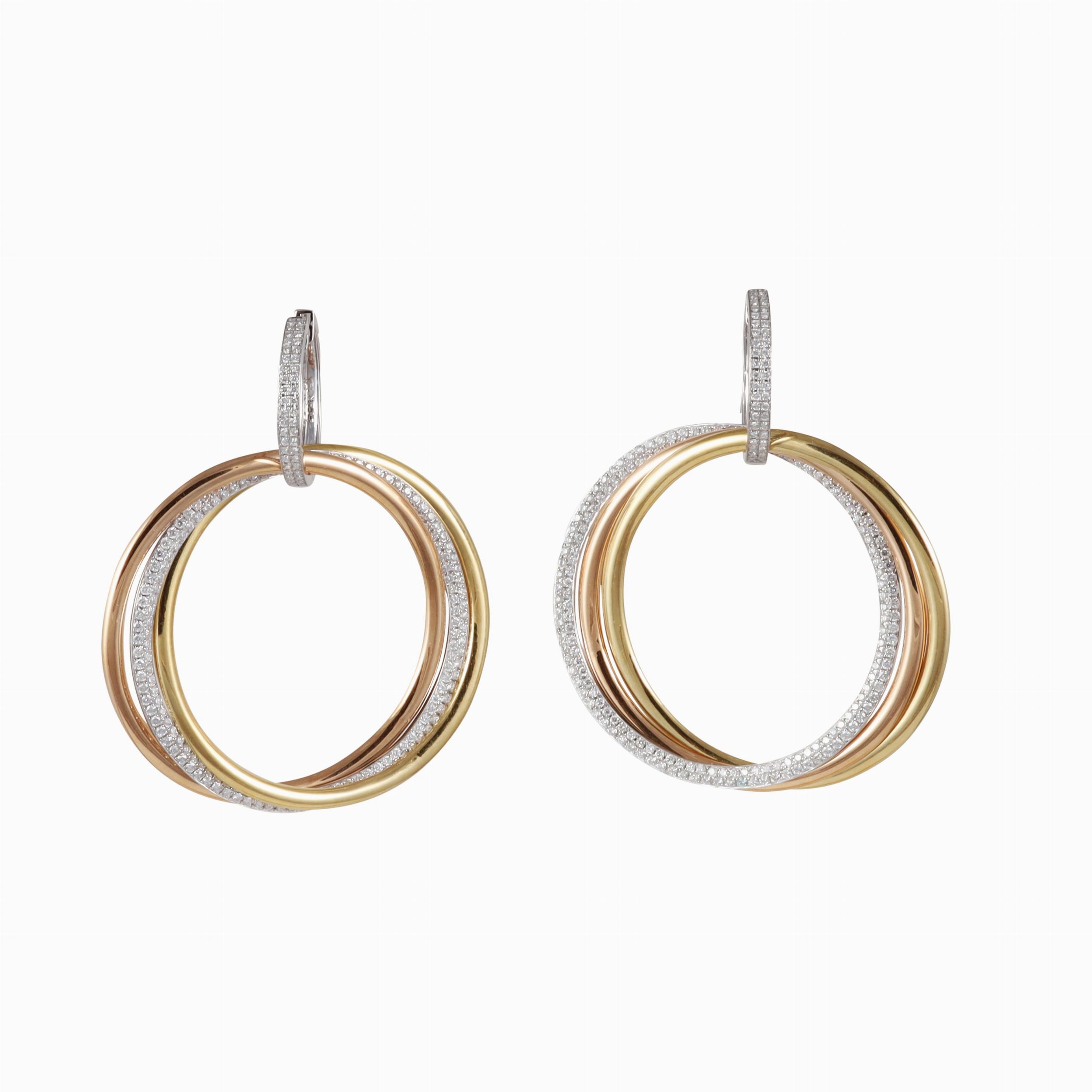 doppio uso, ognuno a tre cerchi sospesi in oro a tre colori sorretti da un anello più piccolo superiore. I cerchi in oro bianco percorsi da piccoli brillanti in pavé del pesi di 3,50 ct ca., gr. 23,9. Dimensioni 6 x 5 cm ca.