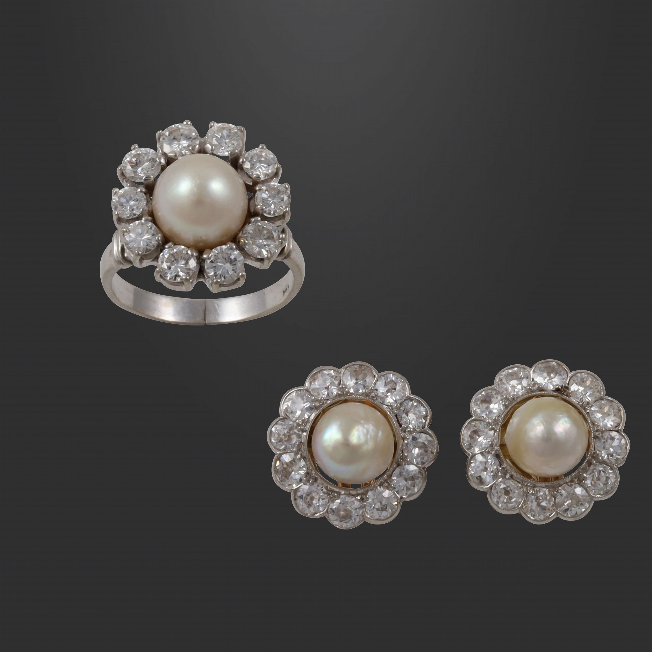a clip in oro giallo e platino con perle naturali d'acqua salata 7,53-7,69 x 5,35 e 7,59-7,70 x 5,46 mm, contornate da diamanti taglio antico europeo del peso complessivo di 2,40 ct ca. Anello in oro bianco con perla coltivata e brillanti a contorno del peso complessivo di 1,80 ct ca. Gr. complessivi 16,2. Misura anello 12 Analisi gemmologica n. J24053mn del 24/07/2024 rilasciata dal laboratorio RAG di Torino, attestante che le perle montate sugli orecchini sono naturali di acqua salata