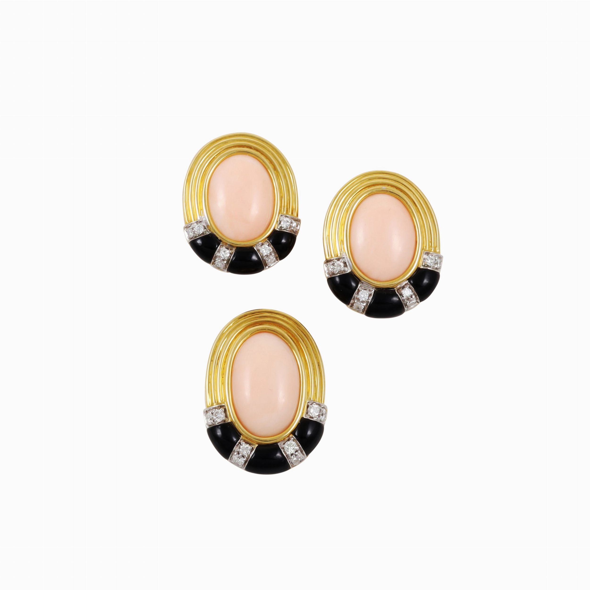in oro giallo e bianco composta da orecchini e pendente a forma ovale con coralli rosa taglio cabochon, onici e brillanti, gr. complessivi 24. Dimensioni pendente 2,6 x 2 cm ca.; orecchini 2,5 x 1,9 cm ca.