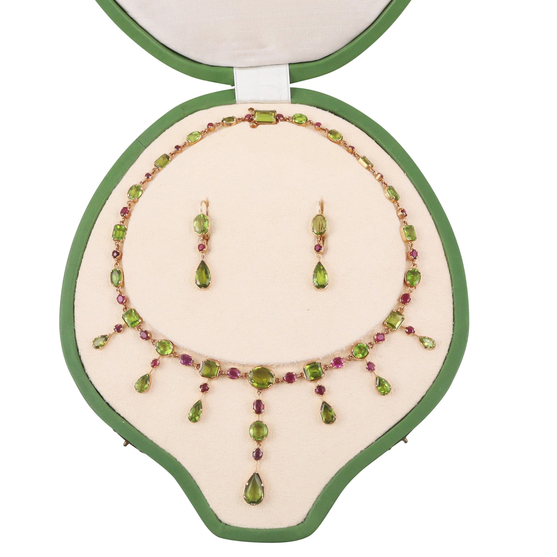 in oro rosa composta da girocollo interamente percorso da peridoti alternati a tormaline rosa evidenziato anteriormente da pendenti. Orecchini 'en suite', gr. complessivi 42,7. Corredata da custodia. Lunghezza girocollo 40 cm; orecchini 4 cm ca.