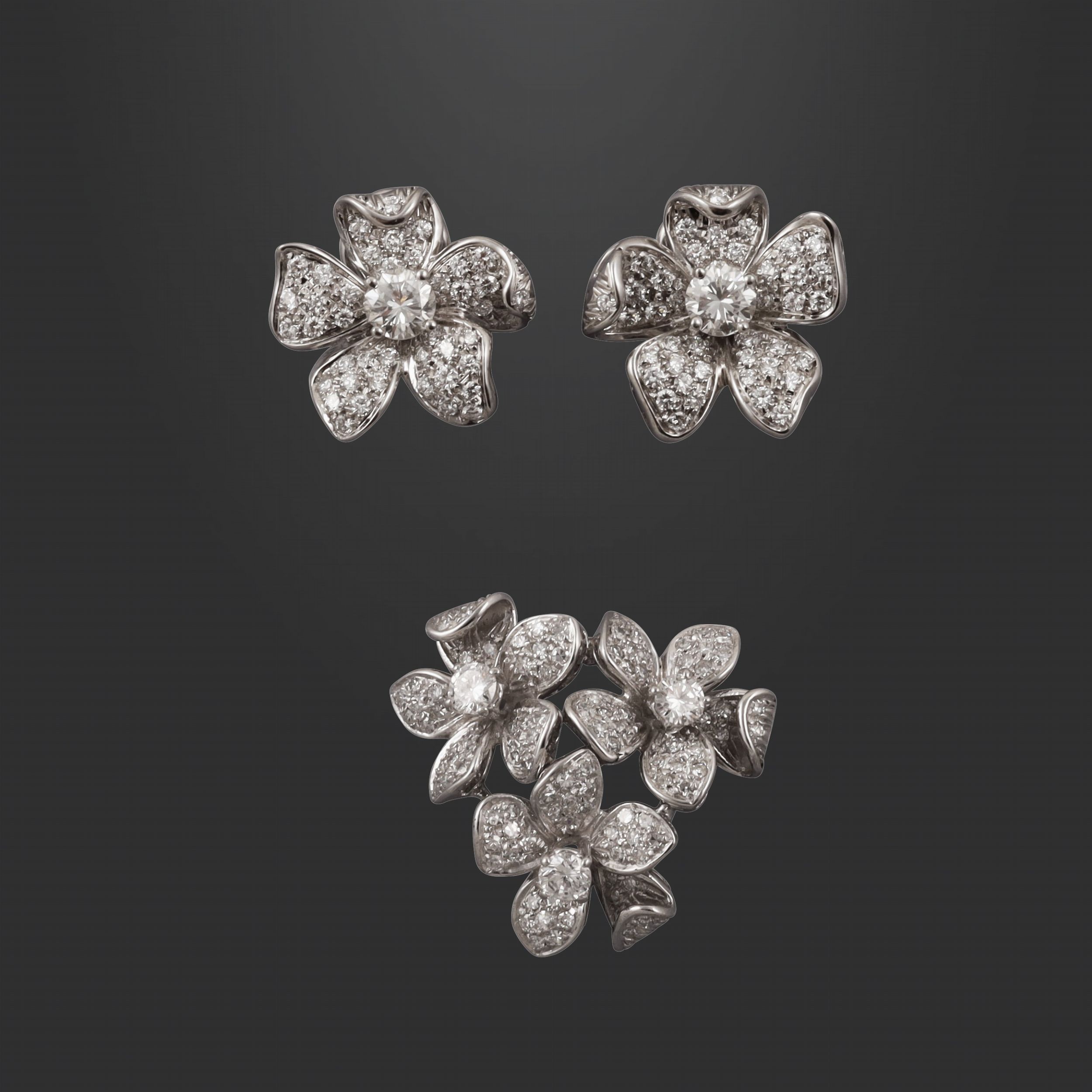 floreale in oro bianco composta da spilla e orecchini con brillanti del peso complessivo di 2,20 ct ca., gr. complessivi 19,9. Dimensioni spilla 3 x 3 cm ca.