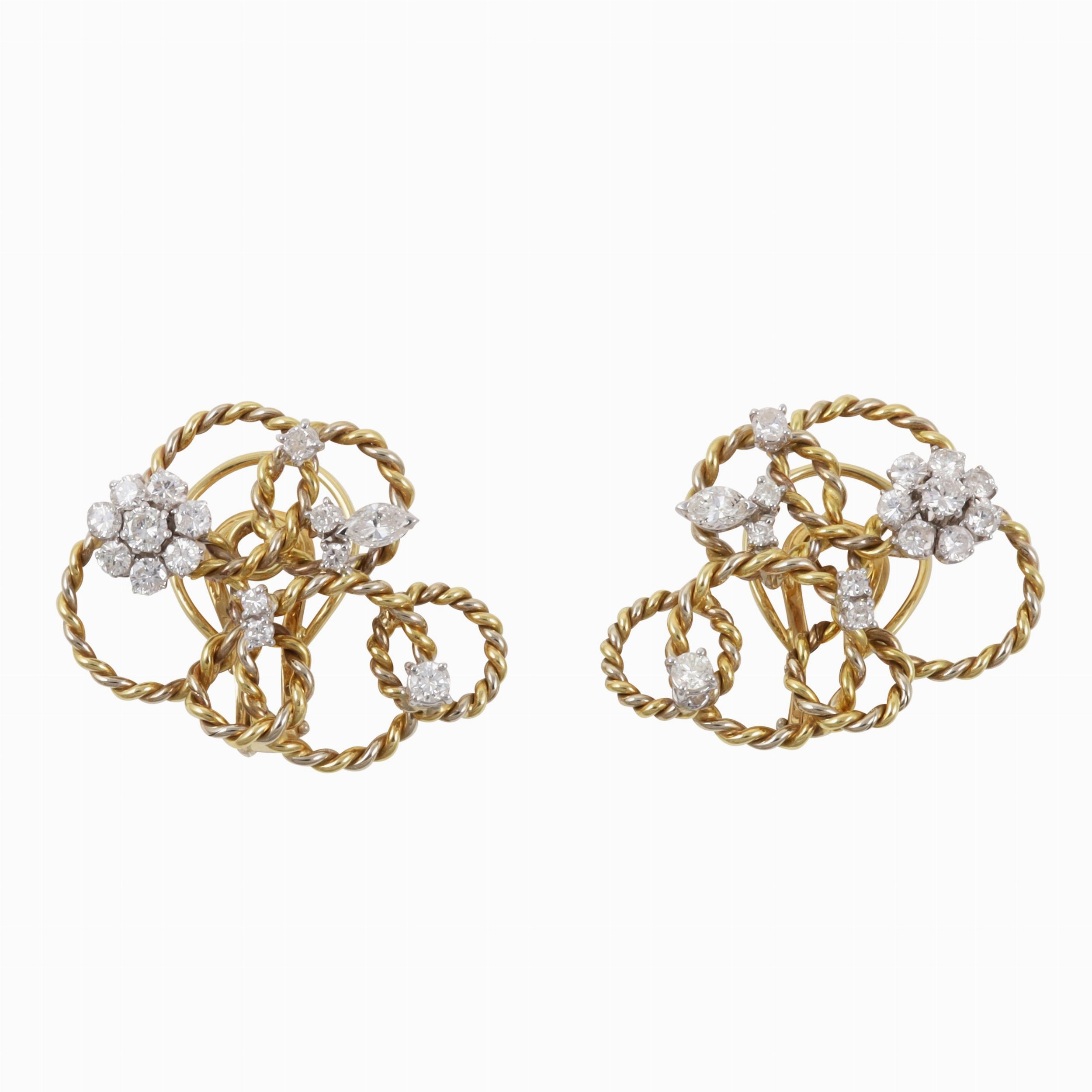 composta da spilla e orecchini a clip, formati da un insieme di cerchi intrecciati in oro giallo lavorato a cordoncino, ornati da brillanti e diamanti taglio navette del peso complessivo di 4,60 ct ca., gr. 47,6. Dimensione spilla 6 x 4 cm ca., orecchini 3,5 x 3 cm ca.
