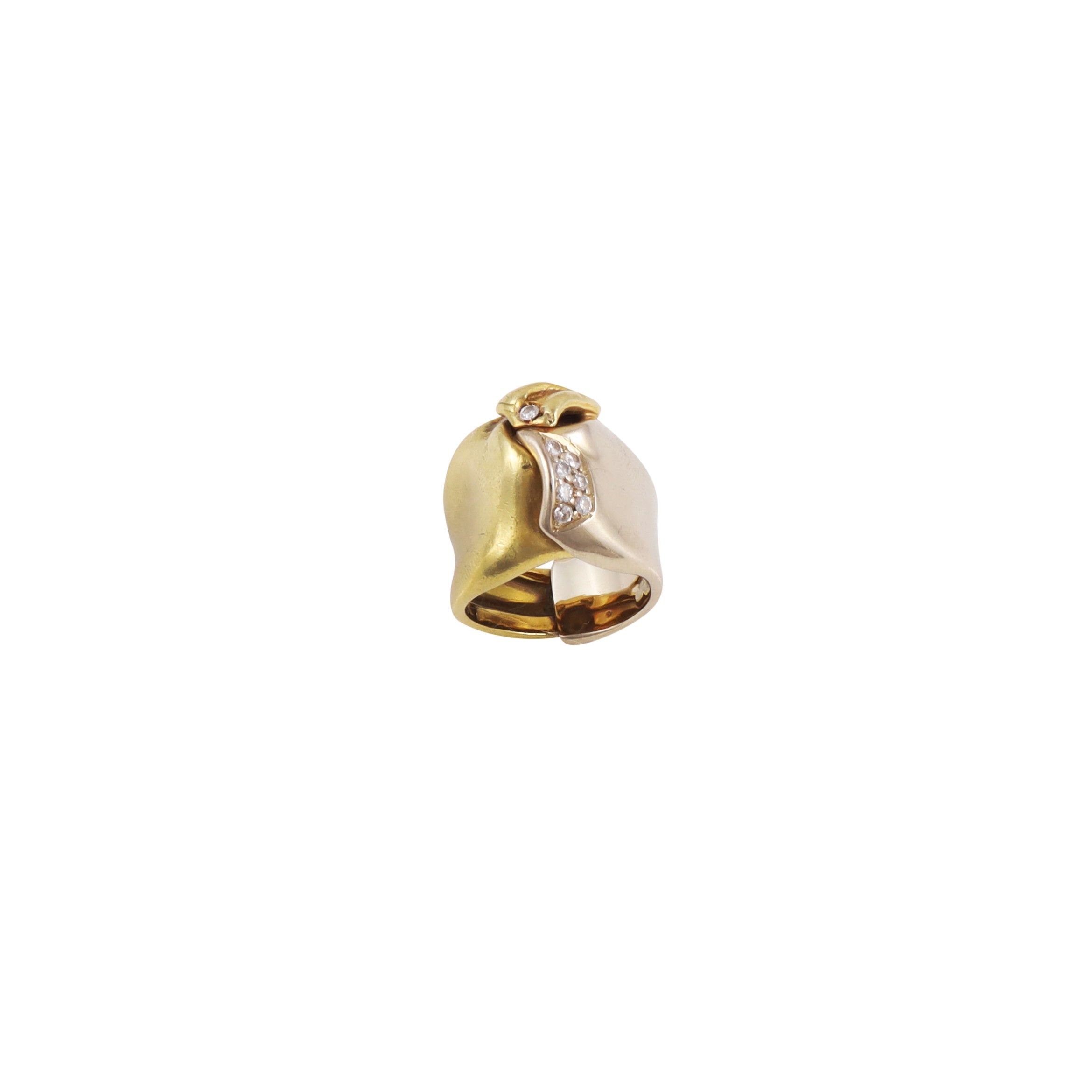 in oro giallo e bianco lucido e satinato, composta da girocollo rigido, bracciale a fascia e anello, evidenziati anteriormente da un motivo a guisa di nodo stilizzato impreziosito da brillanti, gr. complessivi 100. Diametro interno girocollo 11 cm ca., circonferenza bracciale 16 cm ca., misura anello 13,5. Firmati: Misani