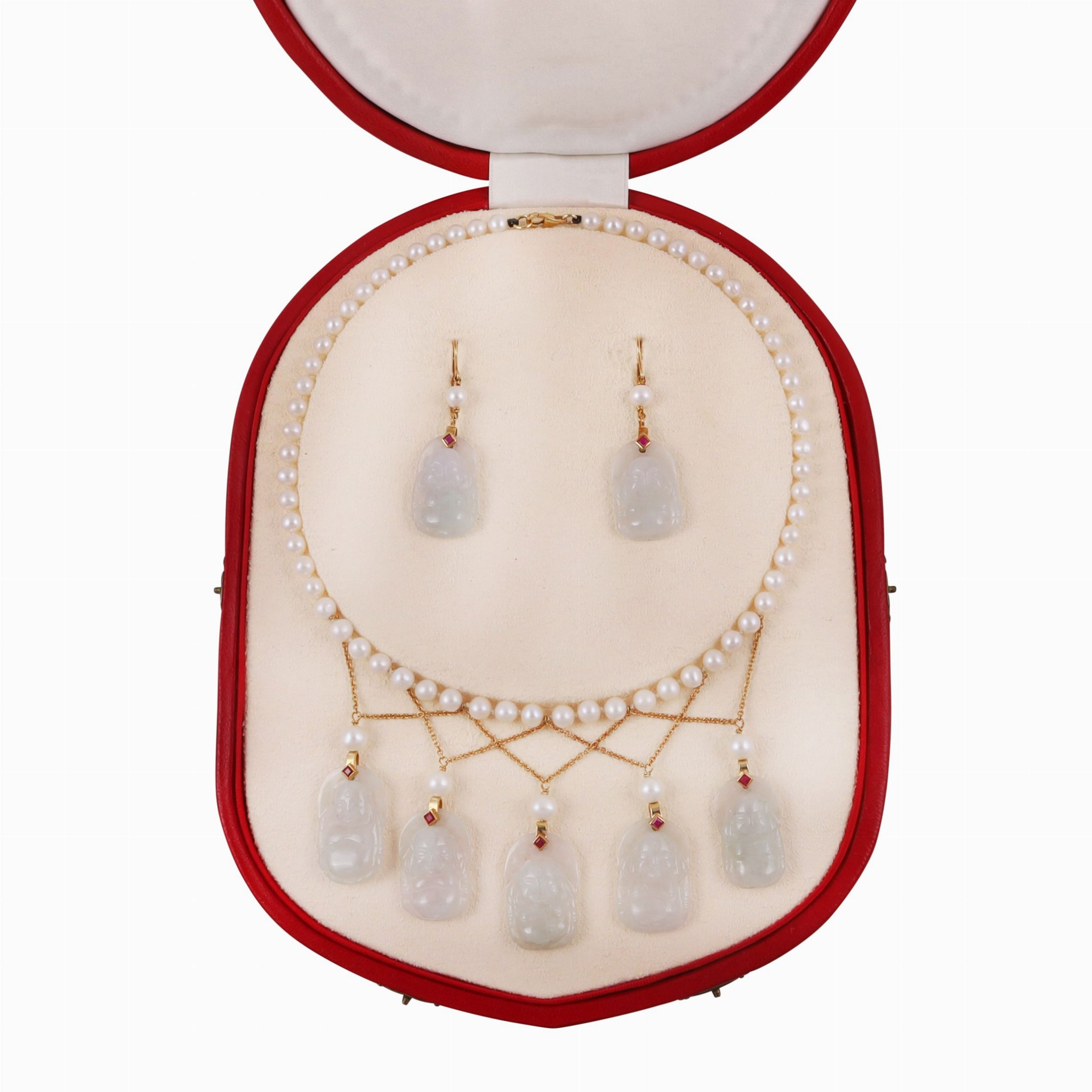 composta da girocollo a un filo di perle d'acqua dolce, ornato anteriormente da catenelle in oro giallo con cinque pendenti raffiguranti Buddha in giadeite ciascuno con perla e piccolo rubino taglio carré e orecchini pendenti 'en suite'. Corredata da custodia. Lunghezza 42 cm, orecchini 5,5 cm ca.