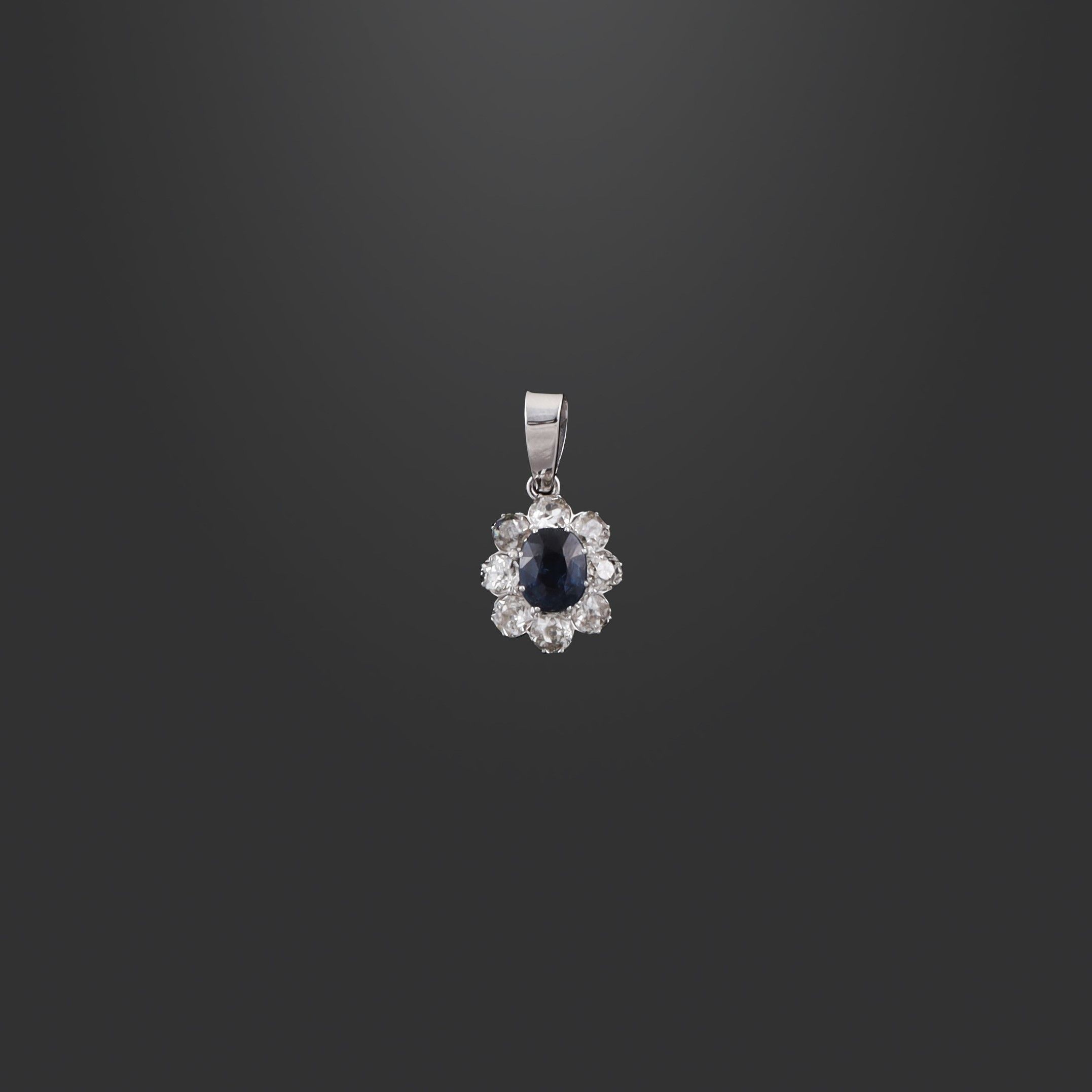 in oro bianco con zaffiro ovale del peso di 0,80 ct ca., contornato da diamanti taglio antico europeo del peso complessivo di 1 ct ca., gr. 2,8. Dimensioni 2,4 x 1,3 cm ca.