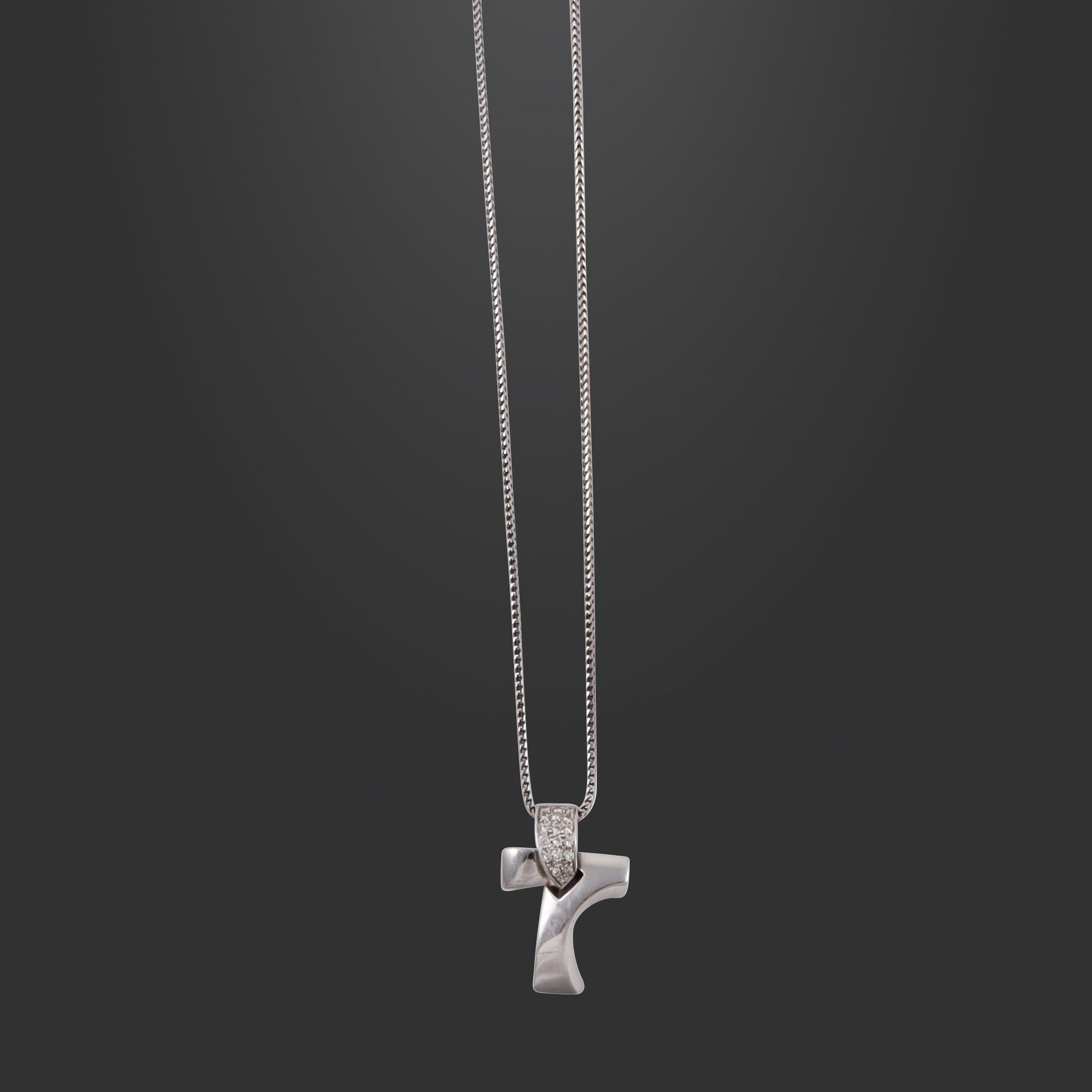 in oro bianco a croce stilizzata, impreziosita da pavé di brillanti, gr. complessivi 14. Misura pendente 2,5 x 1,7 cm ca. Lunghezza catena 60 cm, firmata Vieri