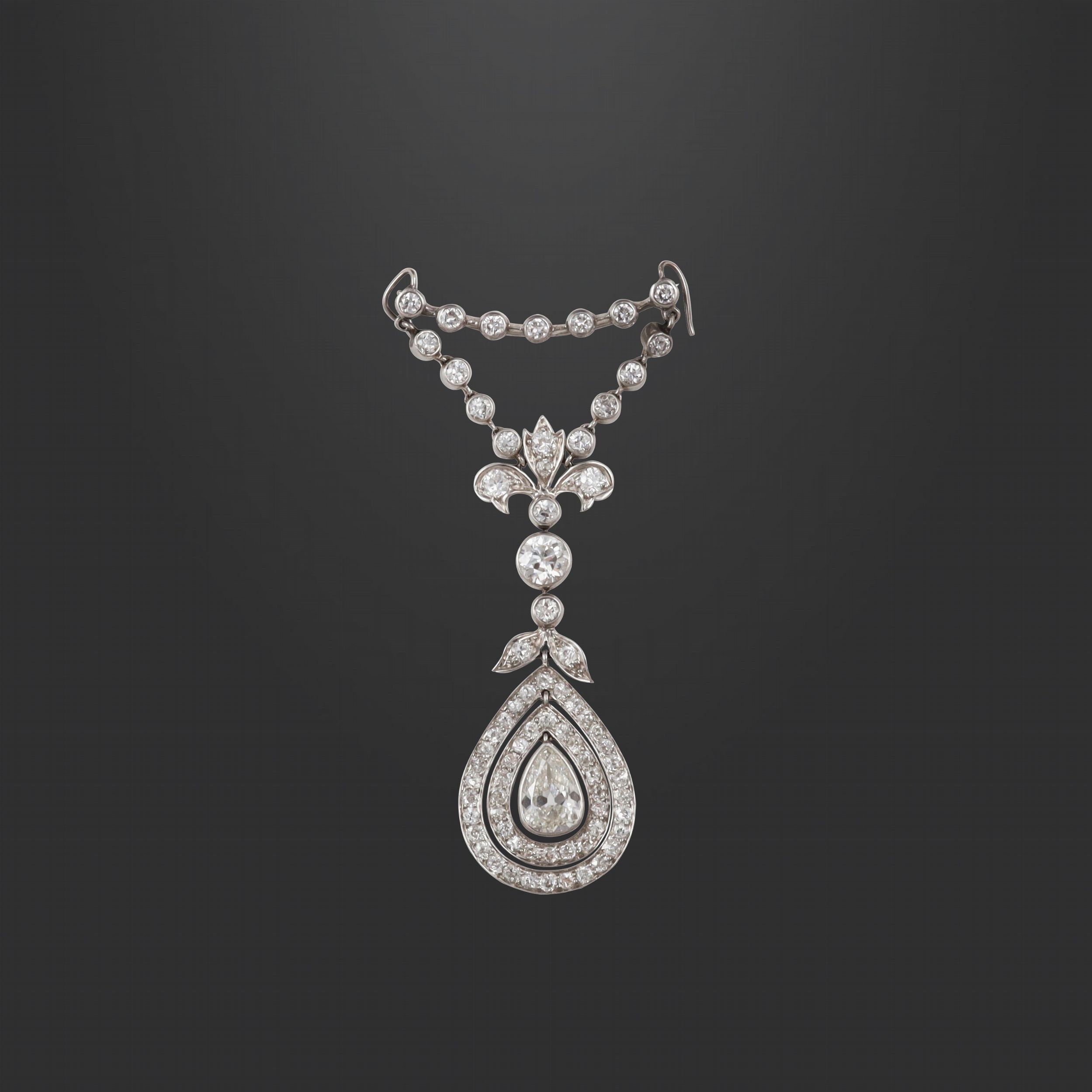 in oro bianco e diamanti taglio antico europeo costituito da una rivière con decoro sospeso a guisa di giglio a sostegno di un motivo a forma di goccia centrato da un diamante del peso di 1,40 ct ca., sorretto da catenina, gr. complessivi 9,1. Lunghezza catenina 39 cm