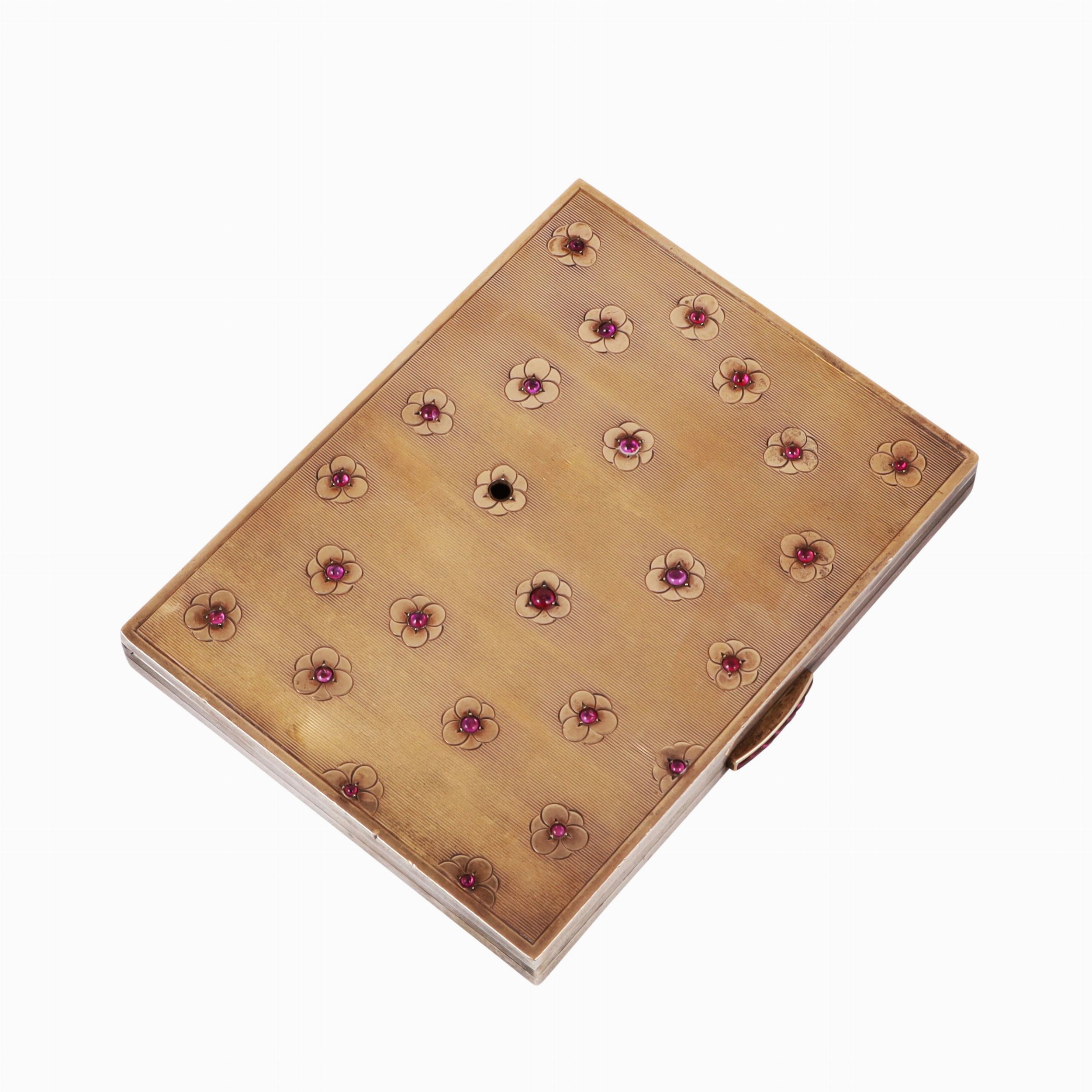 in argento con parte superiore rivestita da una lastra d'oro con motivi floreali centrati da rubini taglio cabochon (uno mancante), pulsante d'apertura ornato da rubini taglio carré, gr. 156 ca. (lievi ammaccature). Dimensioni 10 x 8 cm ca. Manifattura francese