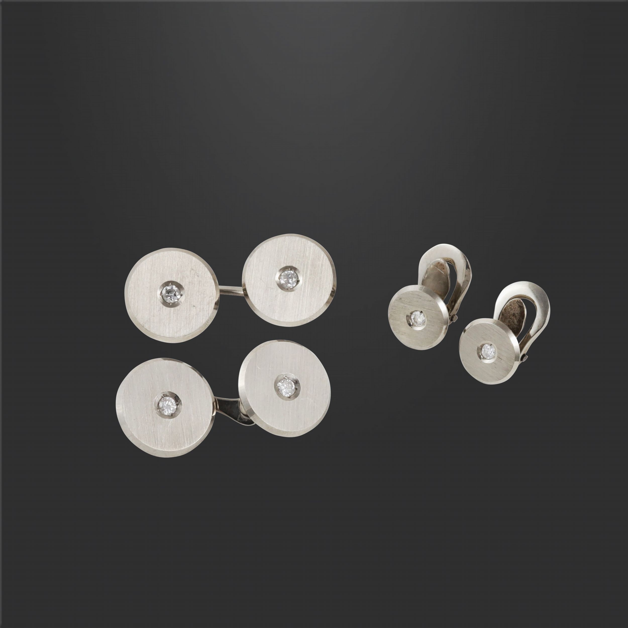 a bottone in oro bianco satinato e brillanti, gr. complessivi 12,5.