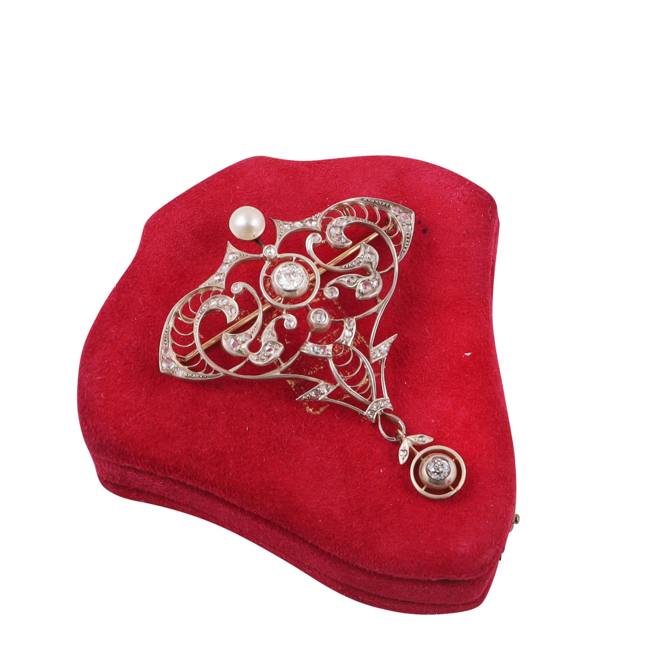 doppio uso, in oro e argento a cartiglio traforata, impreziosita da due diamanti taglio antico europeo e diamanti taglio a rosa, alla sommità una perla, gr. 11,6. Corredata da custodia. Dimensioni 6,5 x 5,5 cm