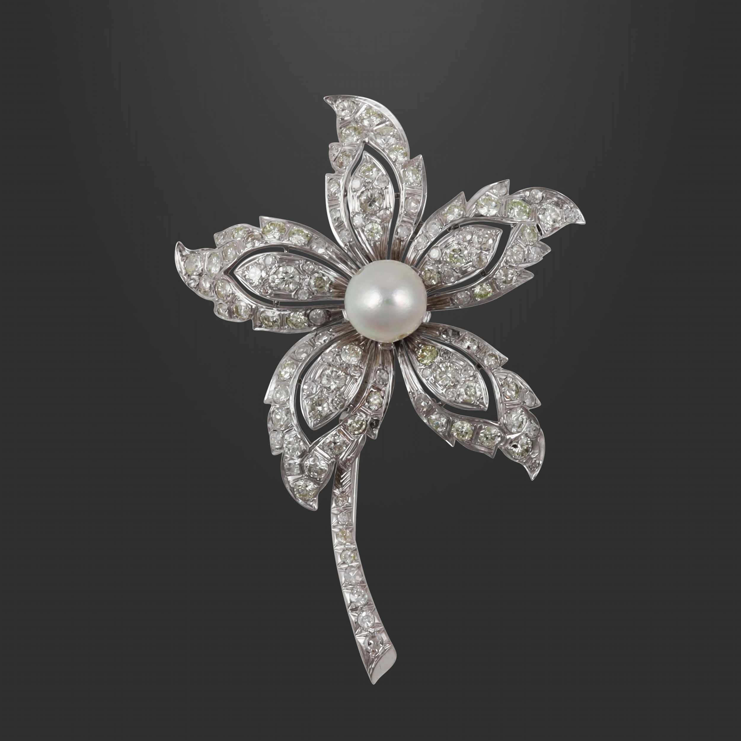 fiore in oro bianco con perla coltivata 9,5 mm posta al centro, petali traforati impreziositi da diamanti del peso complessivo di 3,50 ct ca., gr. 21,9. Dimensioni 7 x 5 cm ca.