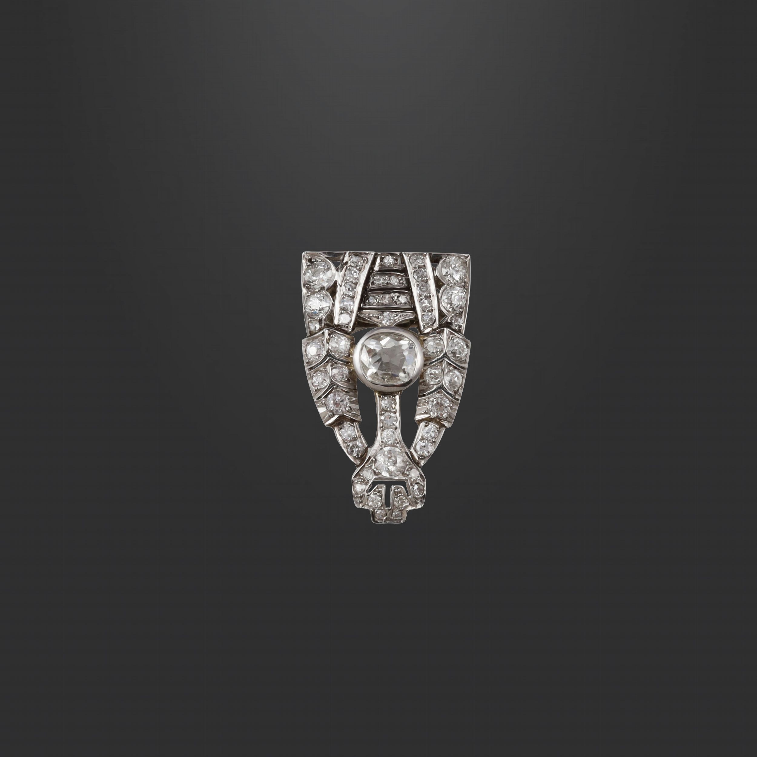 clip a scudo traforata, realizzata in platino con diamanti taglio antico europeo di cui uno di dimensioni maggiori posto al centro, gr. 11,8. Dimensioni 3,5 x 2,2 cm ca.