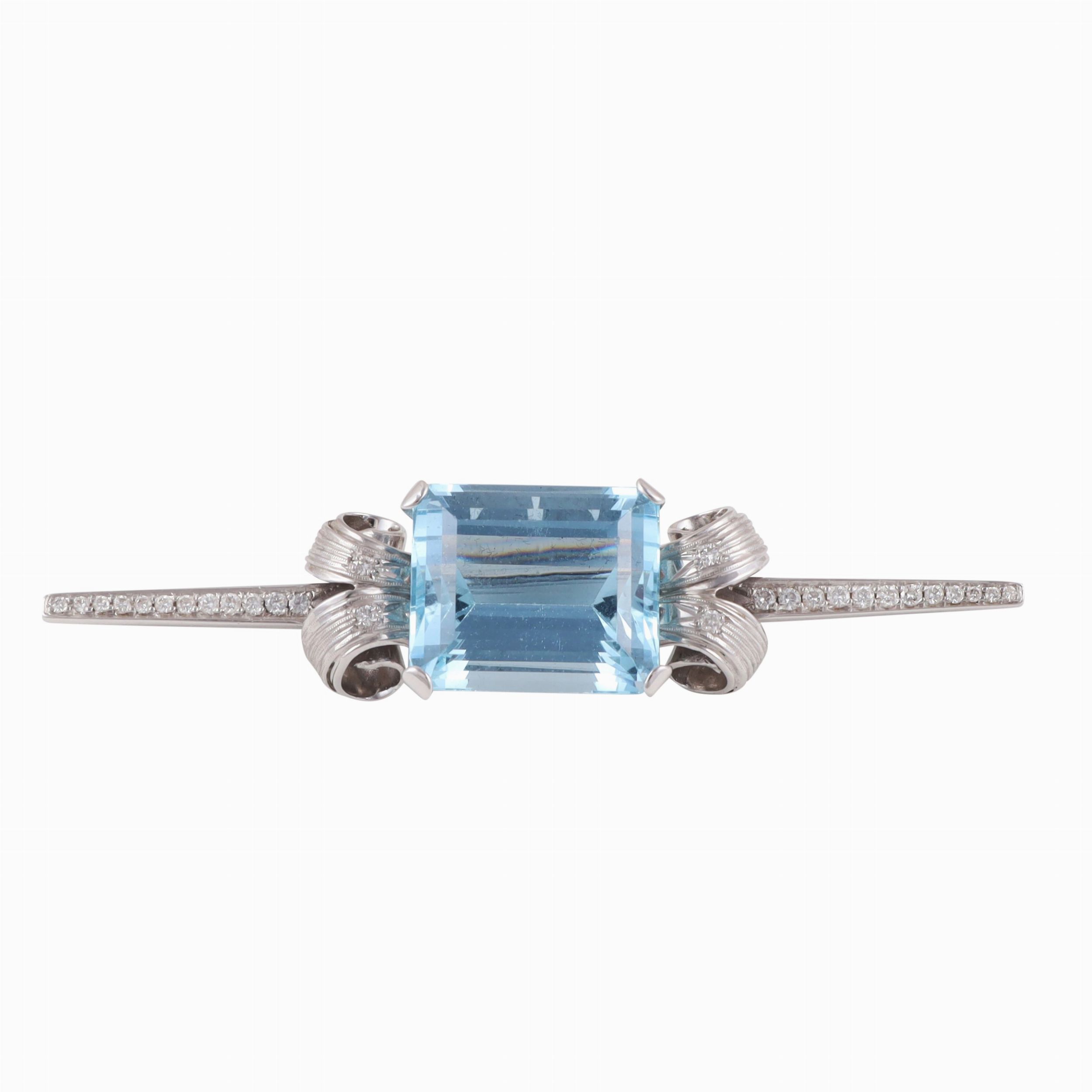 barretta in oro bianco percorsa da brillanti evidenziata al centro da una grande acquamarina rettangolare del peso di 20 ct ca. affiancata da motivi a nastro, gr. 18,8. Lunghezza 7,5 cm ca.