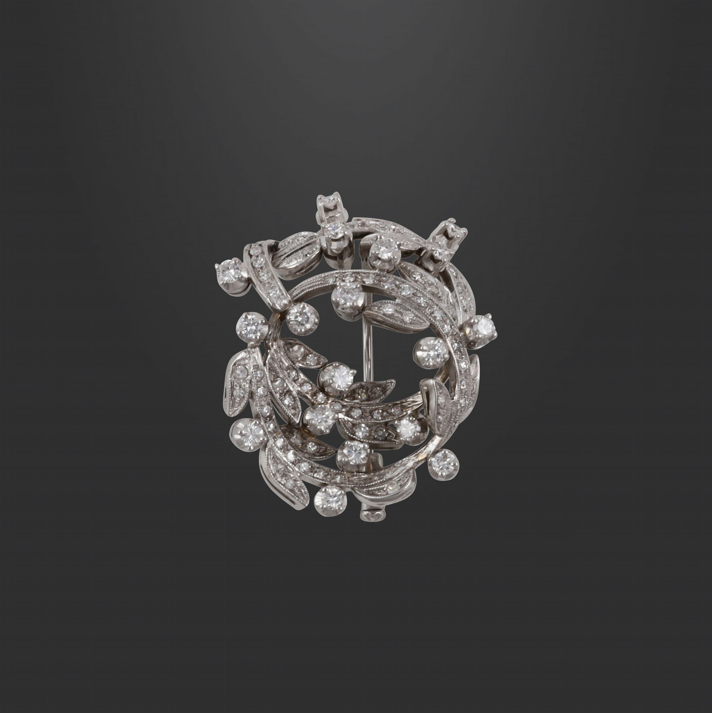 a ghirlanda in oro bianco con diamanti del peso complessivo di 0,80 ct ca., gr. 10,9. Dimensioni 3,3 x 2,8 cm ca.