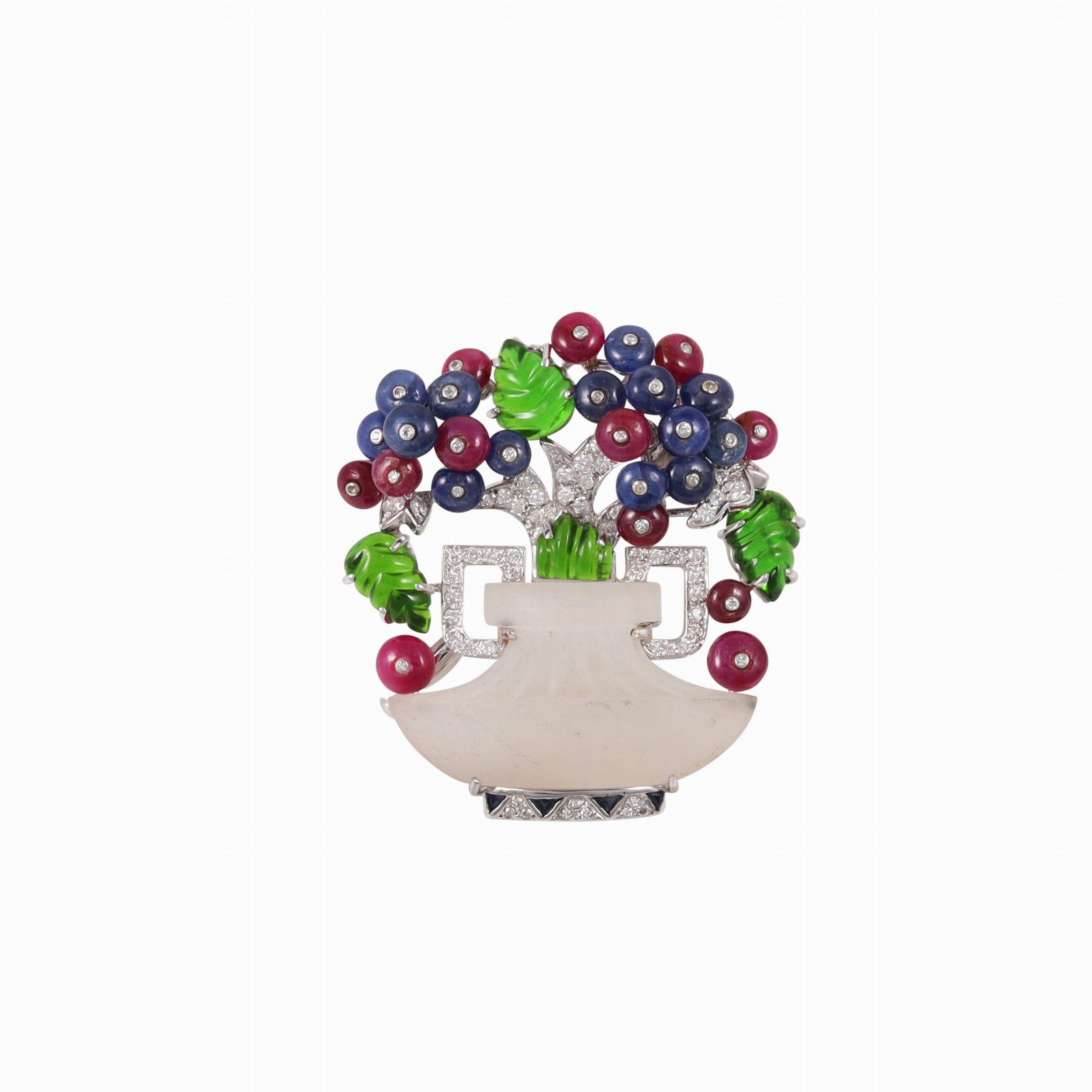 in oro bianco a guisa di vaso fiorito con quarzo ialino inciso, brillanti, sfere di rubino, zaffiro e foglie in tormalina incisa, gr. 27,3. Dimensioni 4,5 x 4,2 cm ca. Numerario: 1932 AL (Legnazzi Roberto S.p.A. - Valenza)
