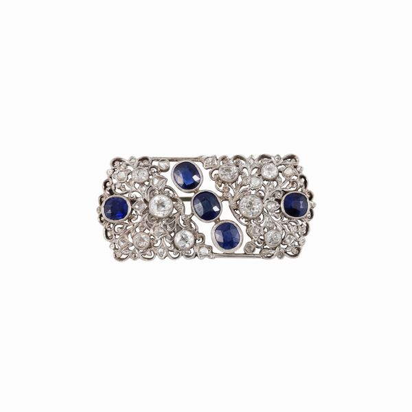 in platino a forma rettangolare traforata a volute ornata da zaffiri del peso complessivo di 4 ct ca. e diamanti taglio antico europeo del peso complessivo di 0,80 ct ca., gr. 14,2. Dimensioni 4,5 x 2 cm ca.