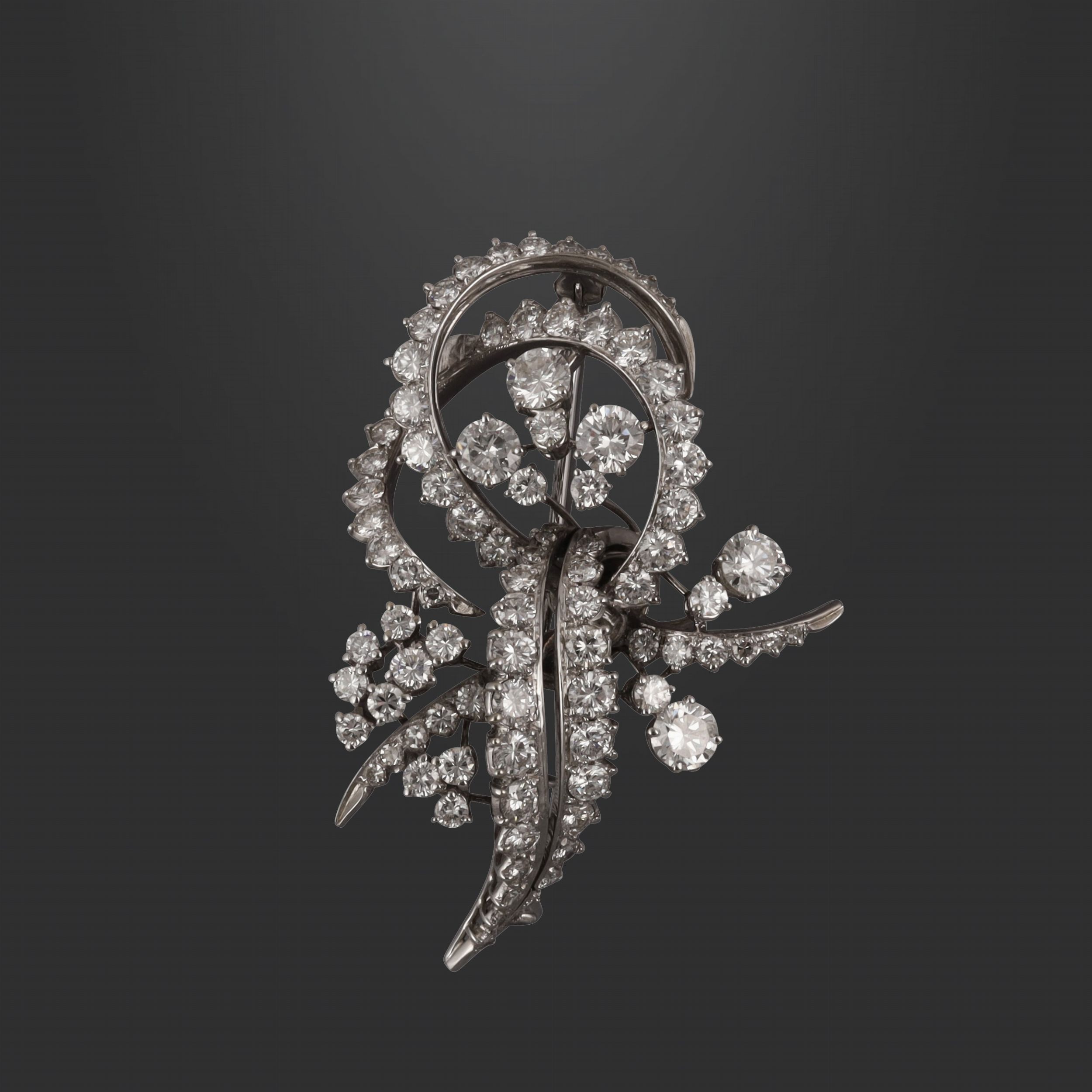 in oro bianco a nastro, ornata da diamanti del peso complessivo di 4,50 ct ca., gr. 11,4. Dimensioni 5 x 2,5 cm ca.