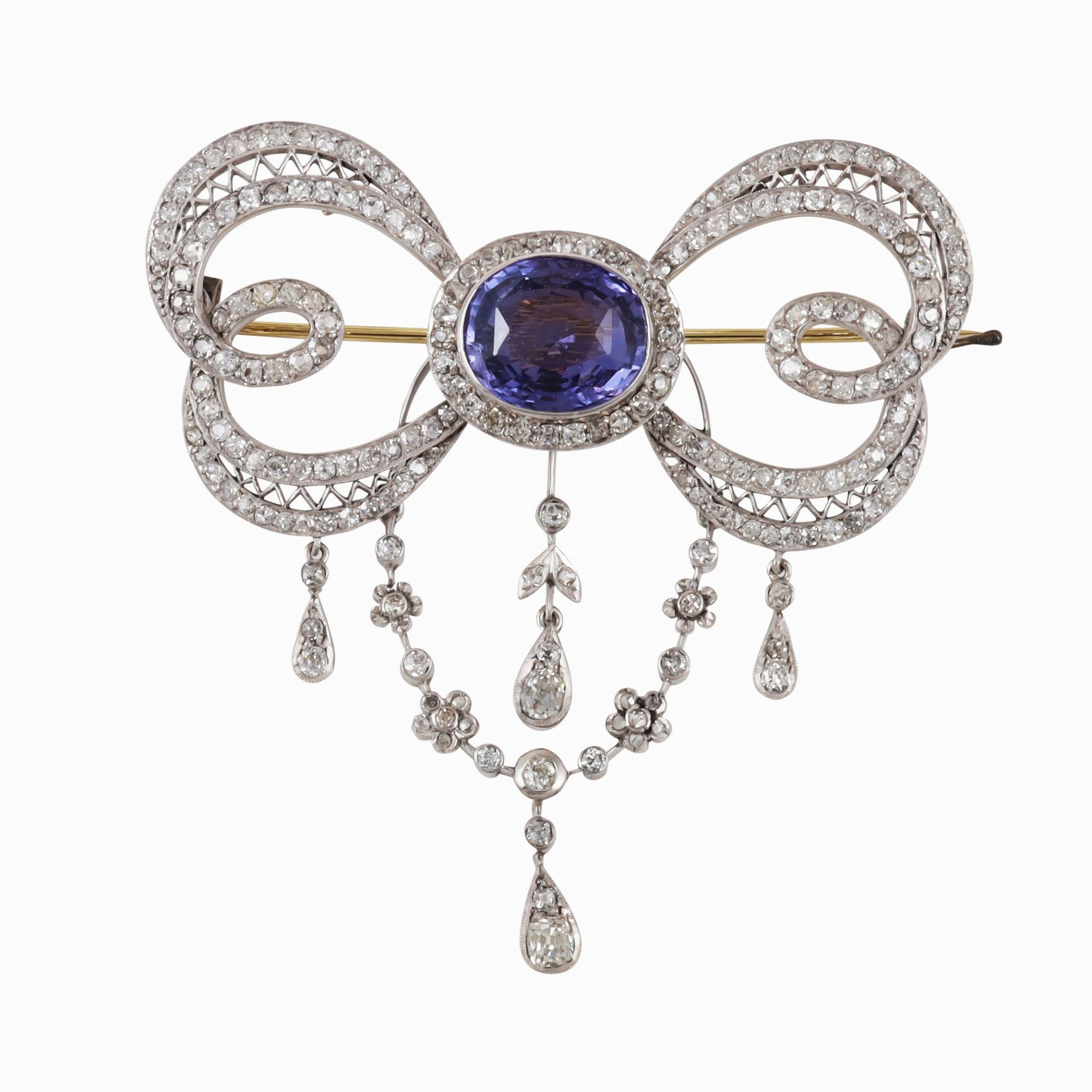 grande fiocco in platino evidenziato al centro da uno zaffiro ovale del peso di 15 ct ca., impreziosito da diamanti taglio antico europeo del peso complessivo di 6 ct ca. Orecchini a clip in oro bianco a semiluna con brillanti. Peso complessivo gr. 37,3 Dimensioni spilla 7,5 x 7,5 cm ca., orecchini 2 x 1,5 cm ca.