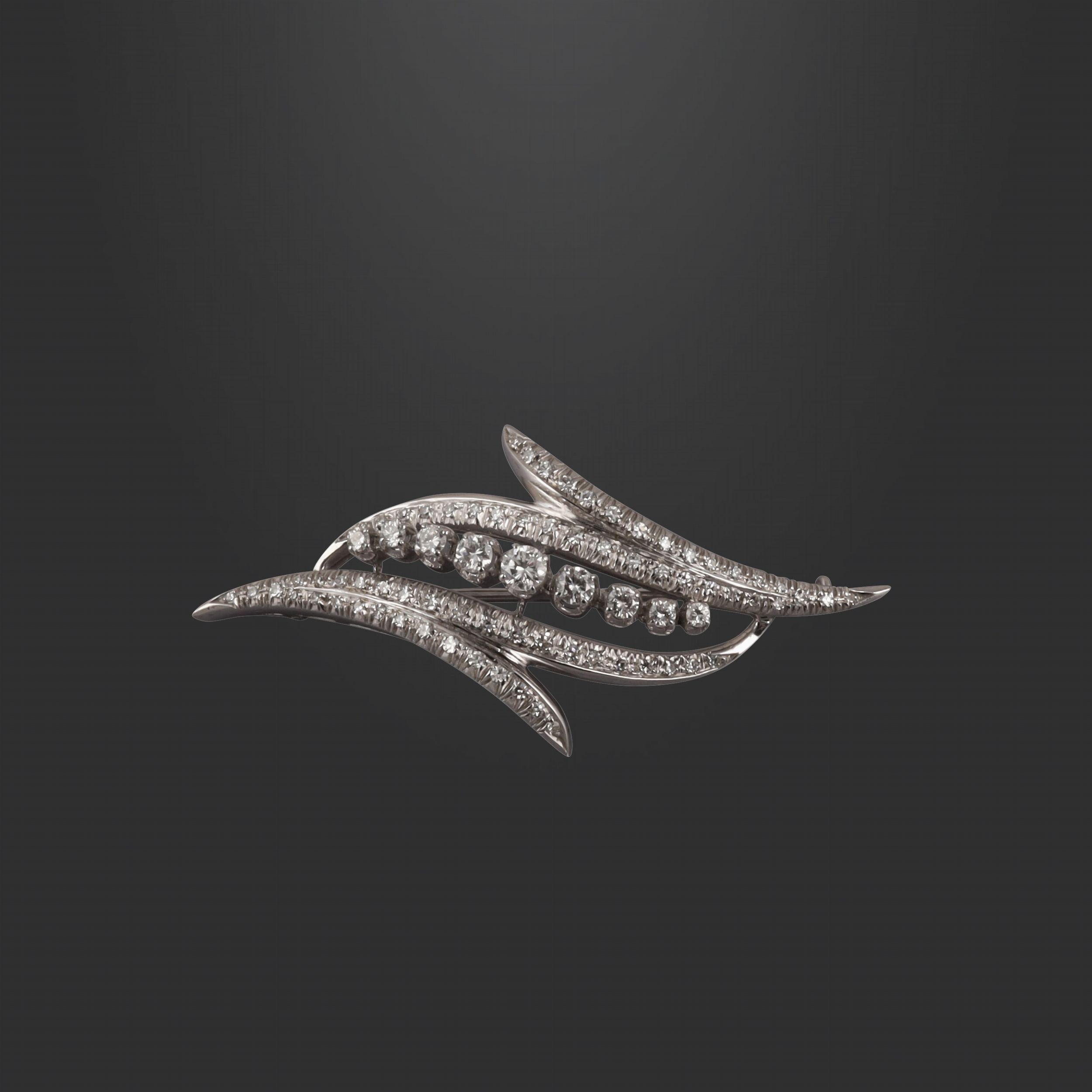 in oro bianco a foglia lanceolata ornata da diamanti, gr. 11,4. Dimensioni 5,7 x 2,8 cm ca. Numerario: 160 AL (Lunati Piero - Valenza)
