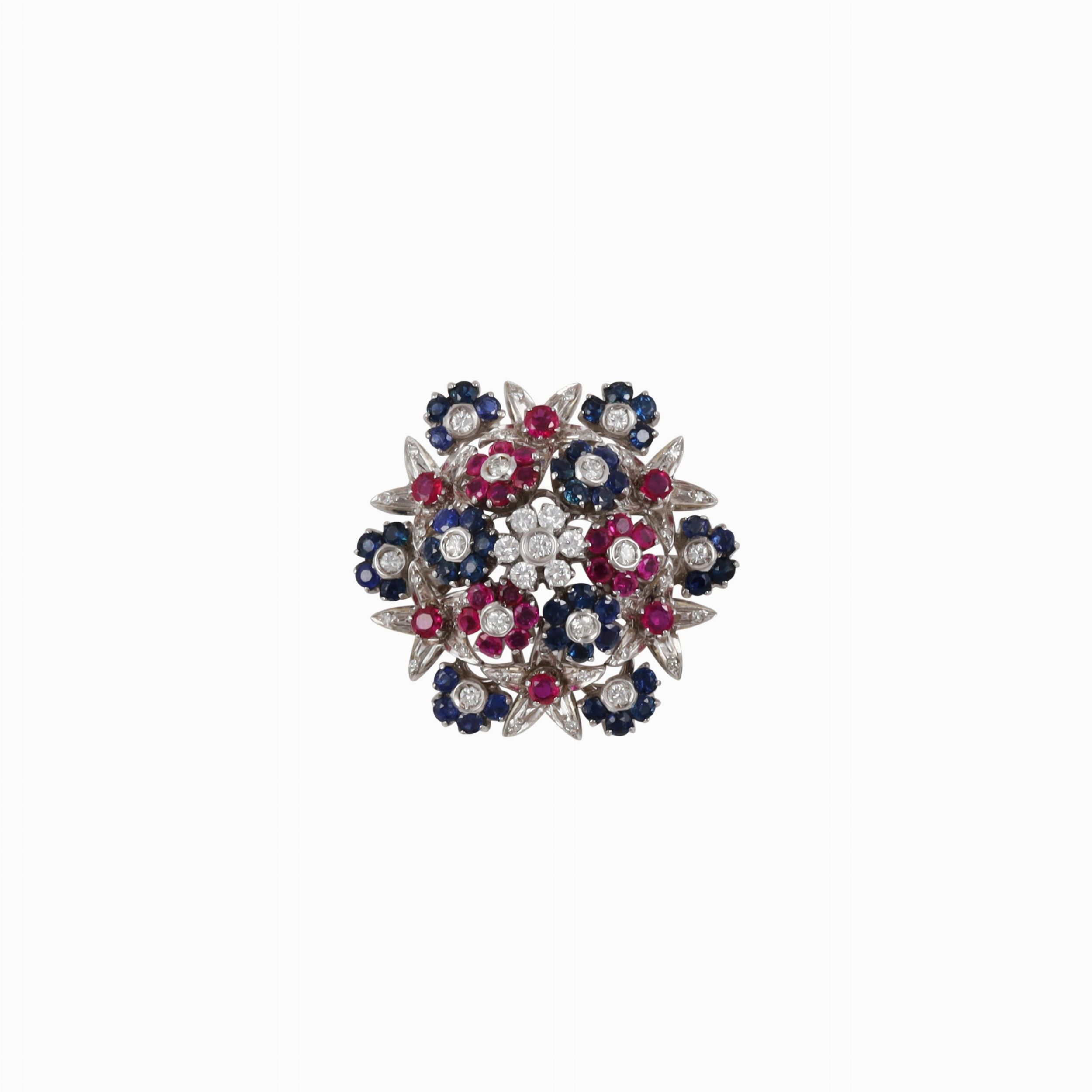 a rosone, formata da motivi floreali 'en tremblant' impreziosita da brillanti, piccoli diamanti, zaffiri e rubini, gr. 15,2. Diametro 2 cm ca. Numerario: 160 AL (Lunati Piero - Valenza)