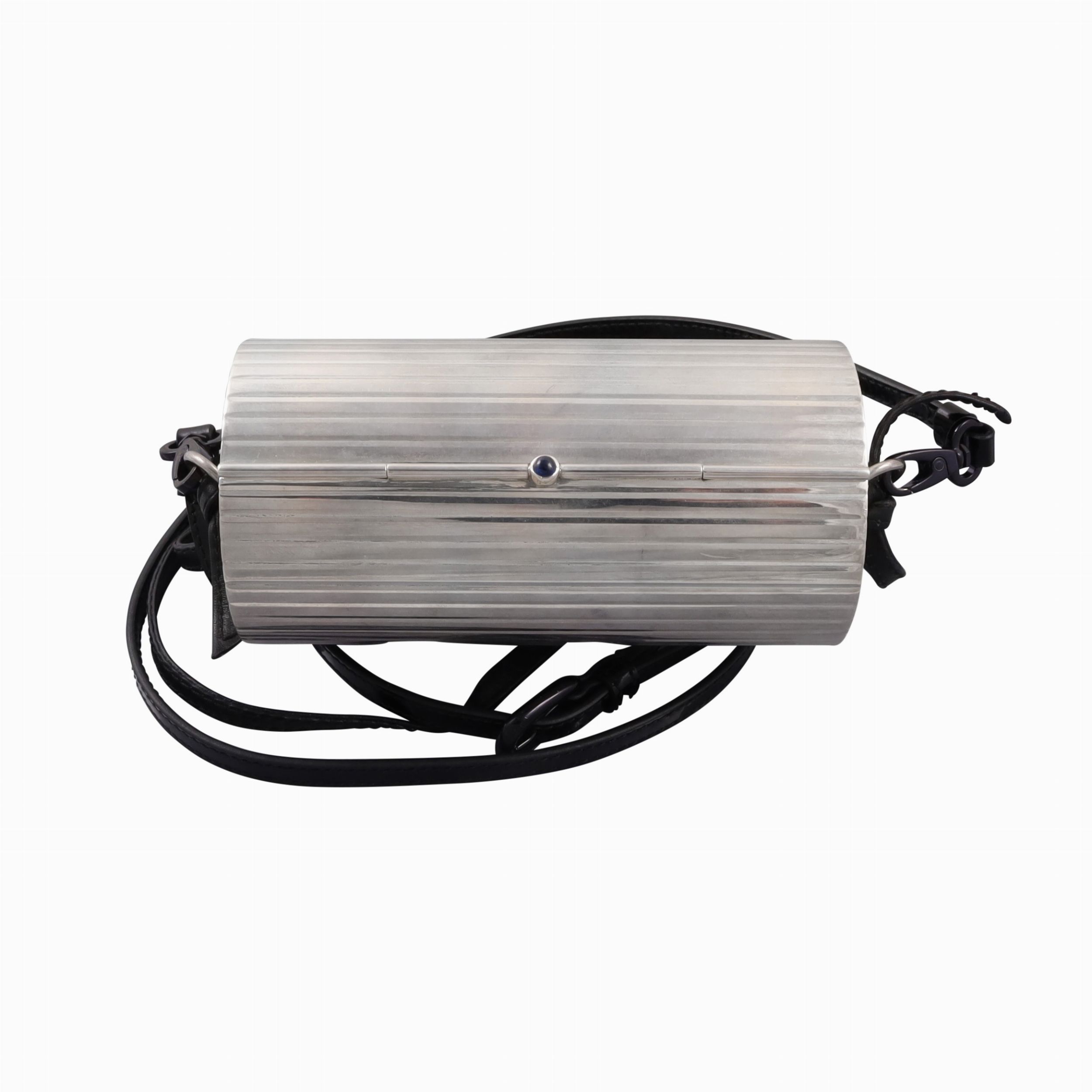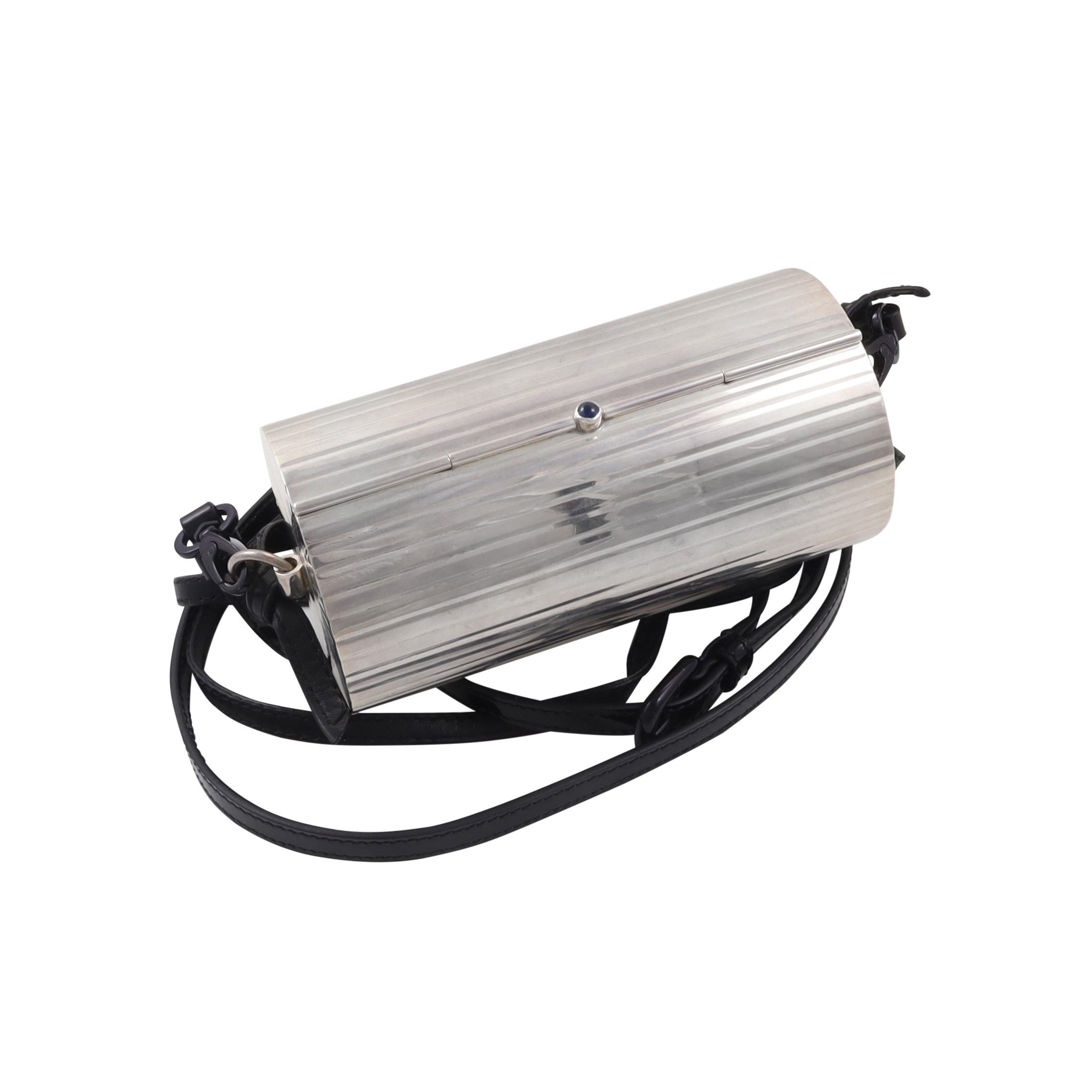 realizzata in argento 925, a corpo cilindrico scanalato, con pulsante di chiusura ornato da uno zaffiro taglio cabochon, all'interno specchio e scomparto, completa di tracolla, gr. netti 471 ca. Lunghezza 13,5 cm, diametro 7 cm ca. Firmata: San Lorenzo Numerario: 859 MI (San Lorenzo s.r.l. - Milano) Designer: Maria Luisa Belgiojoso - 1988
