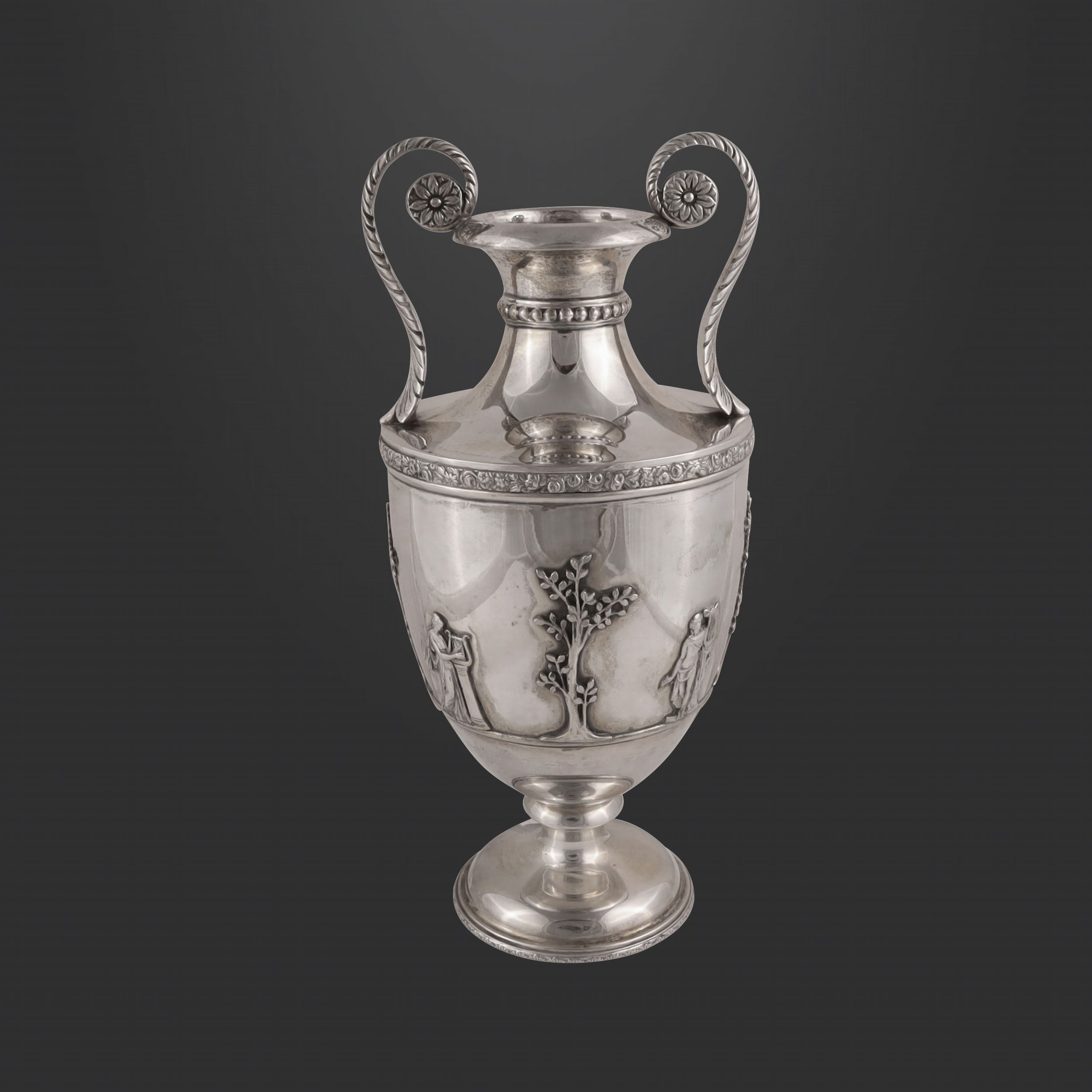 in argento, corpo ad ogiva con anse laterali modellate a fogliame mosso con rosette. Decori in stile neoclassico, gr. 730 gr ca. Altezza 28 cm ca.