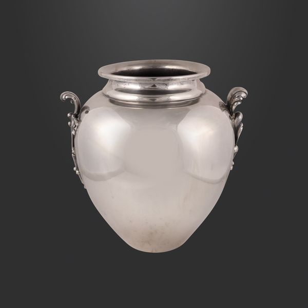 in argento, corpo liscio a giara espansa, bocca svasata e prese laterali fogliate con finali a sfere (lievi ammaccature), gr. 1.400 ca. Altezza 27 cm ca. Numerario: 20 AL (Ricci & C. - Alessandria)