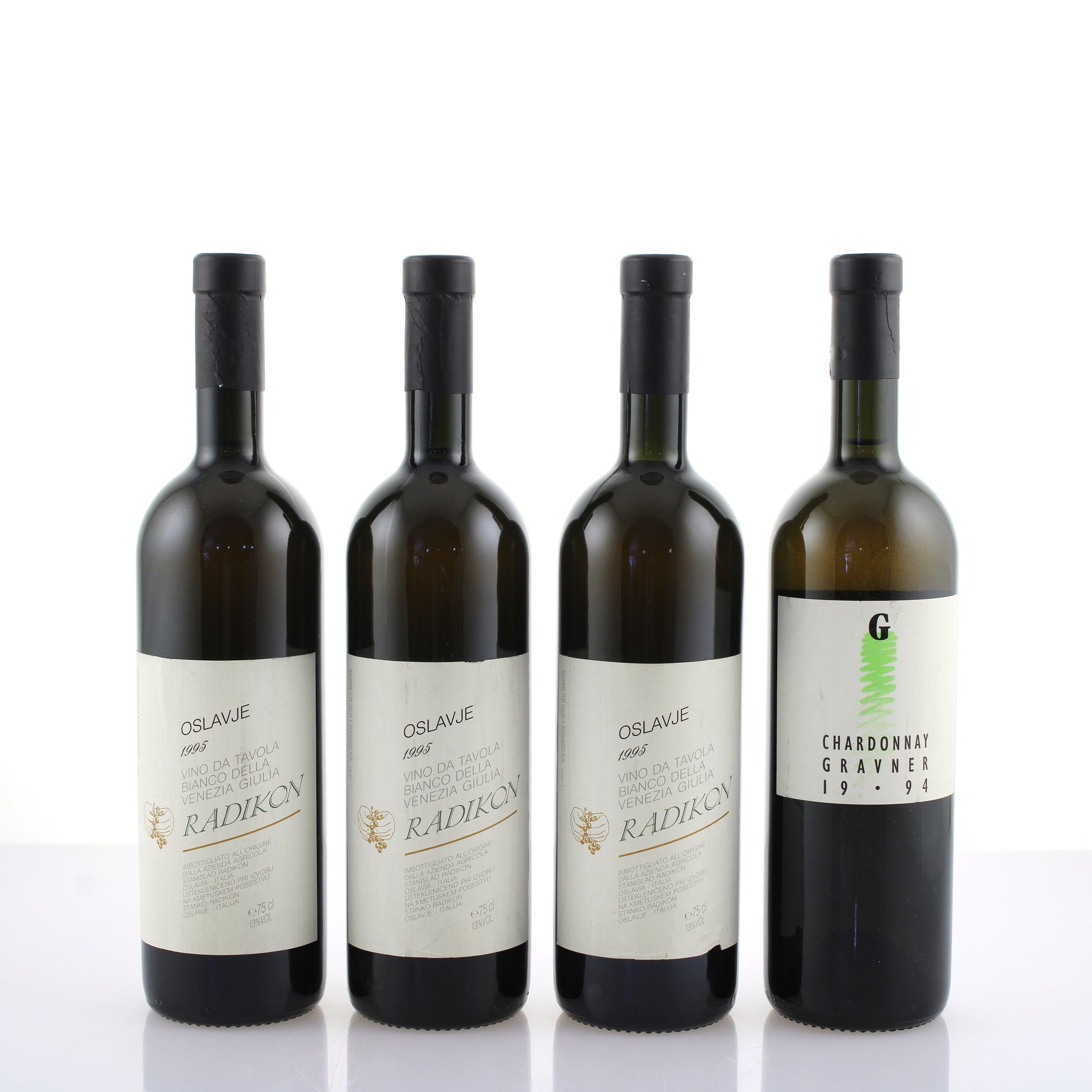 1 bt, Gravner, Chardonnay 1994, base del collo 3 bt, Radikon, Oslavje Bianco 1995, base del collo