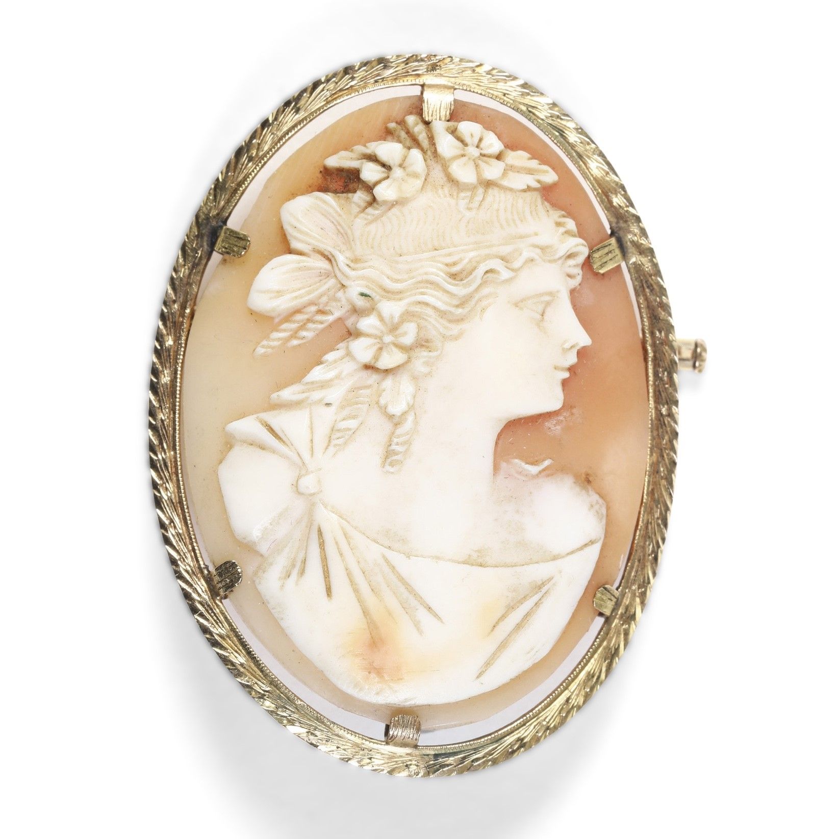 Cammeo ovale in madreperla e oro basso titolo. XIX-XX secolo