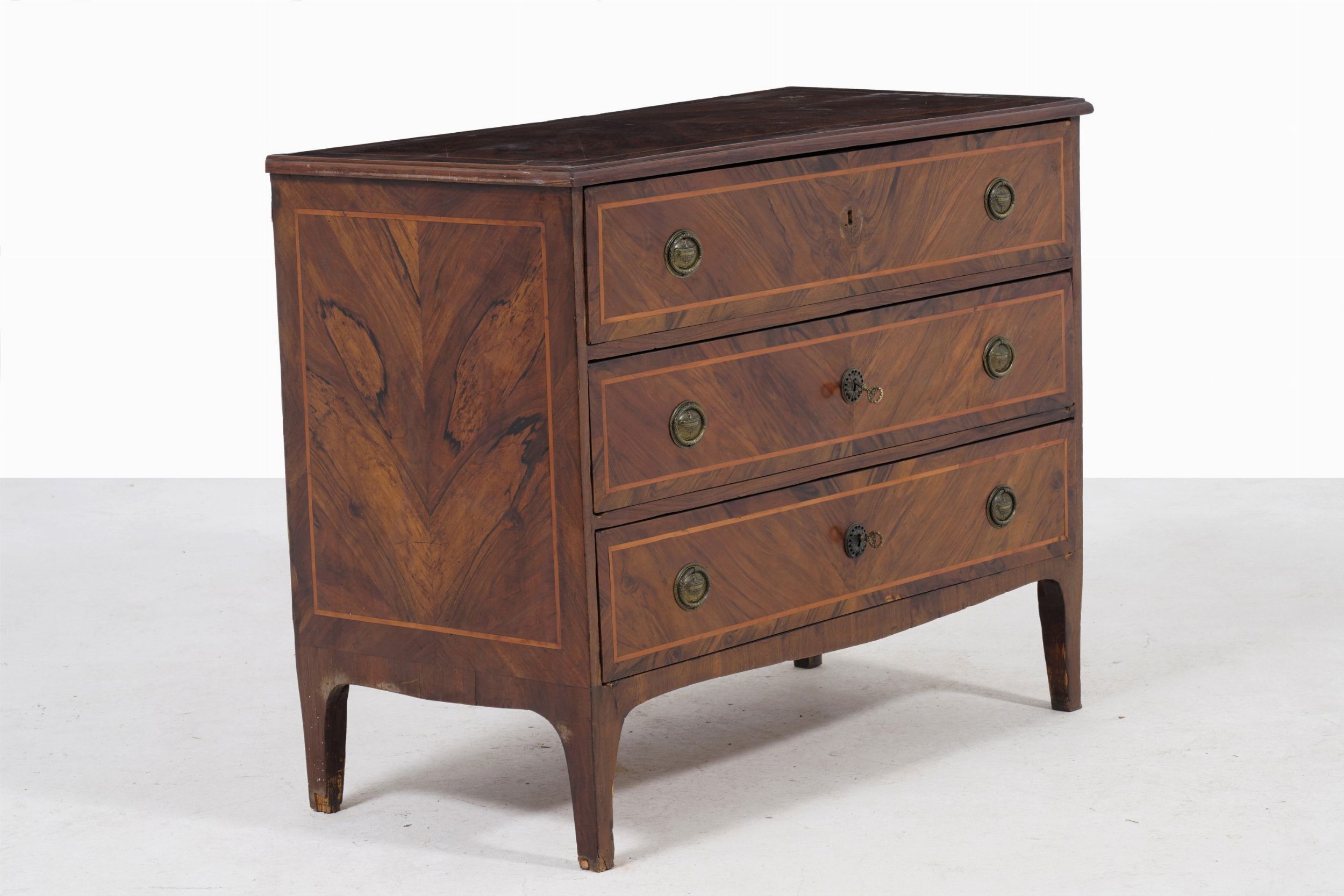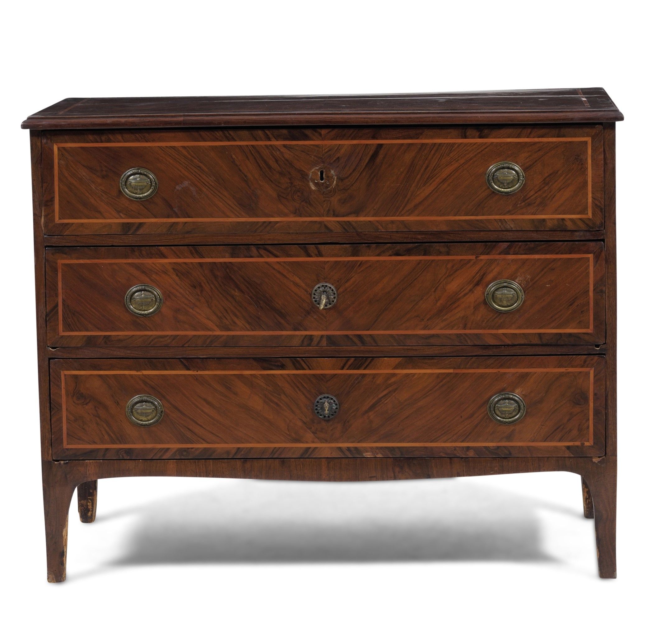 Comò a tre cassetti lastronato e filettato in varie essenze. XVIII-XIX secolo