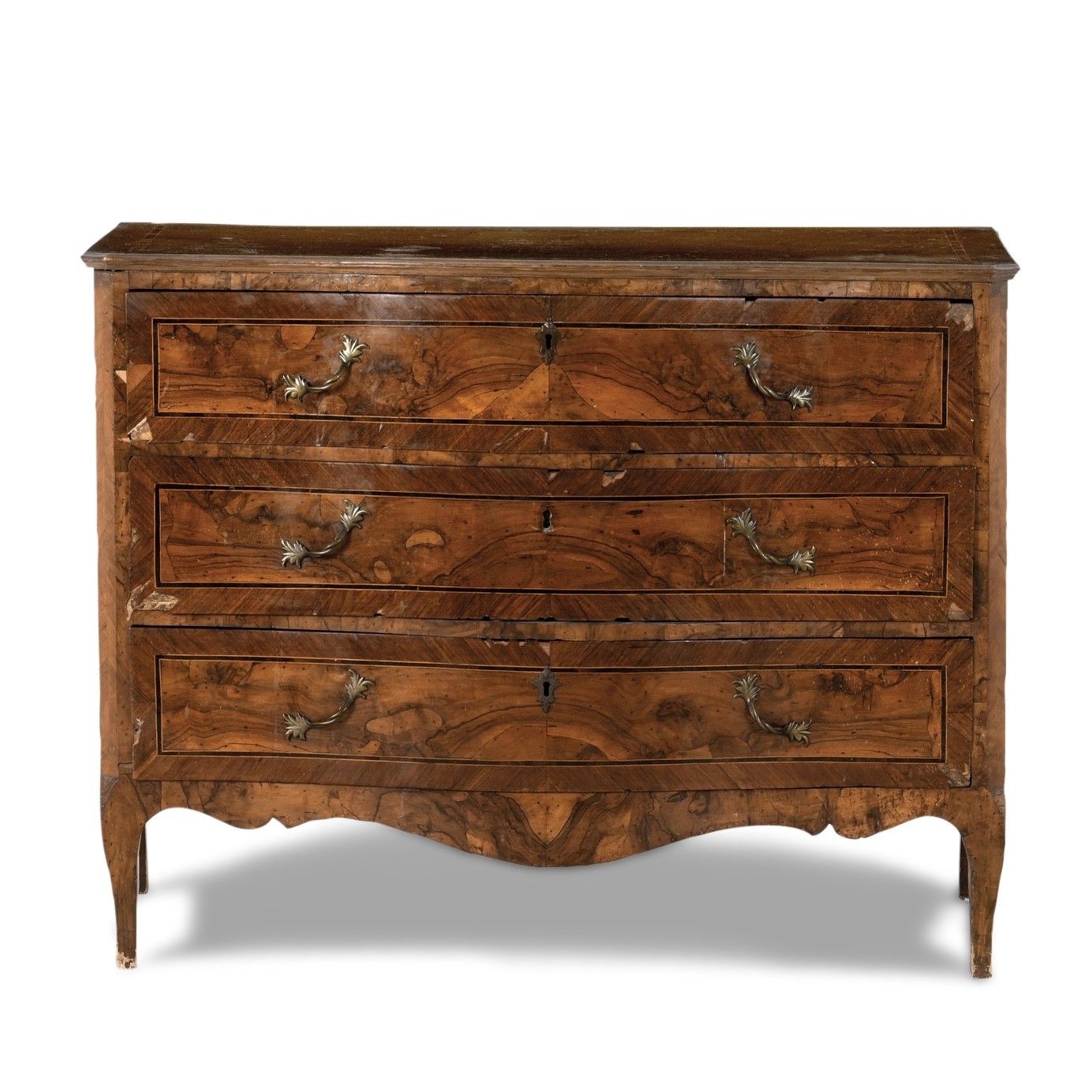 Coṃ lastronato in radica a 3 cassetti. XVIII-XIX secolo