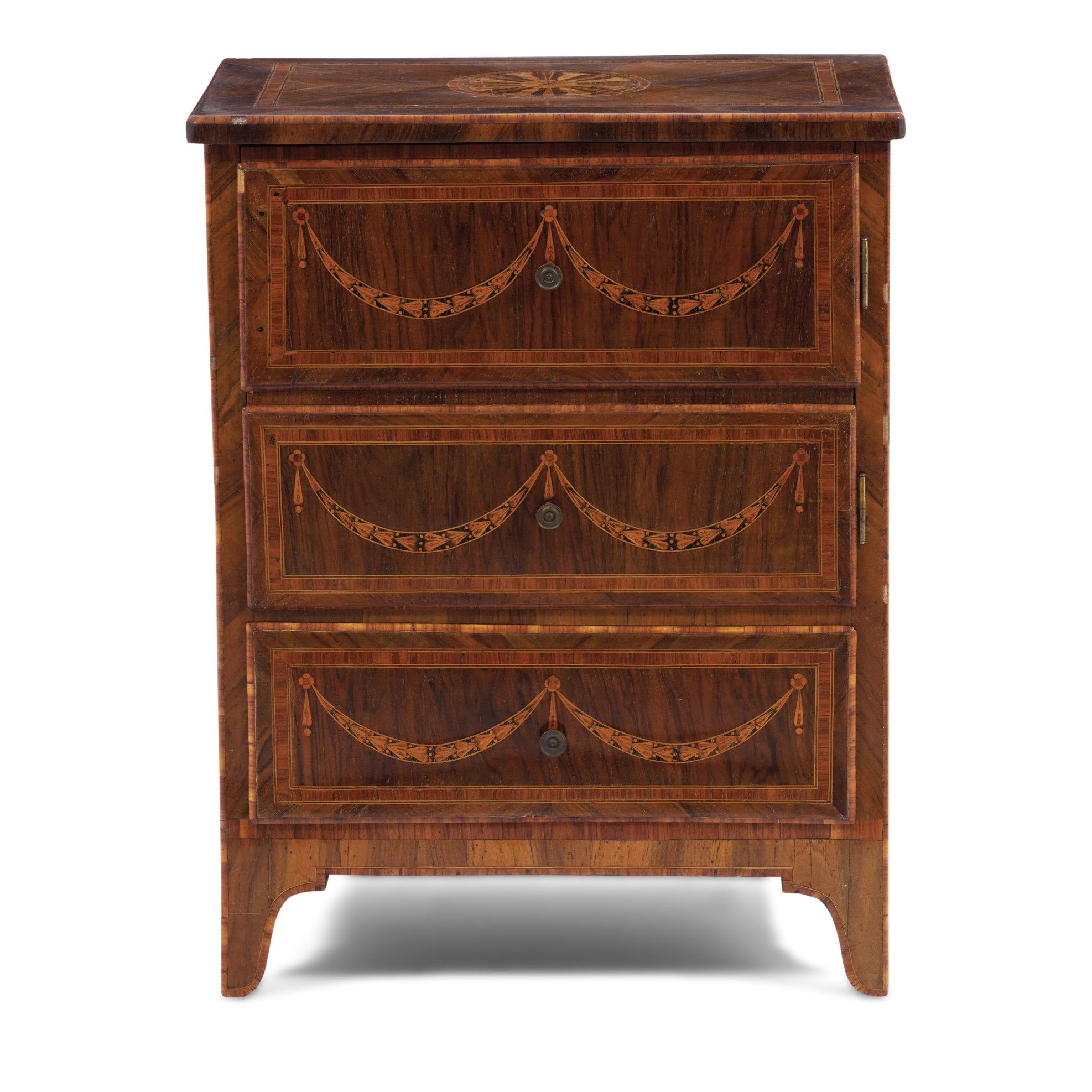 Comodino lastronato e intarsiato. Fine XVIII secolo