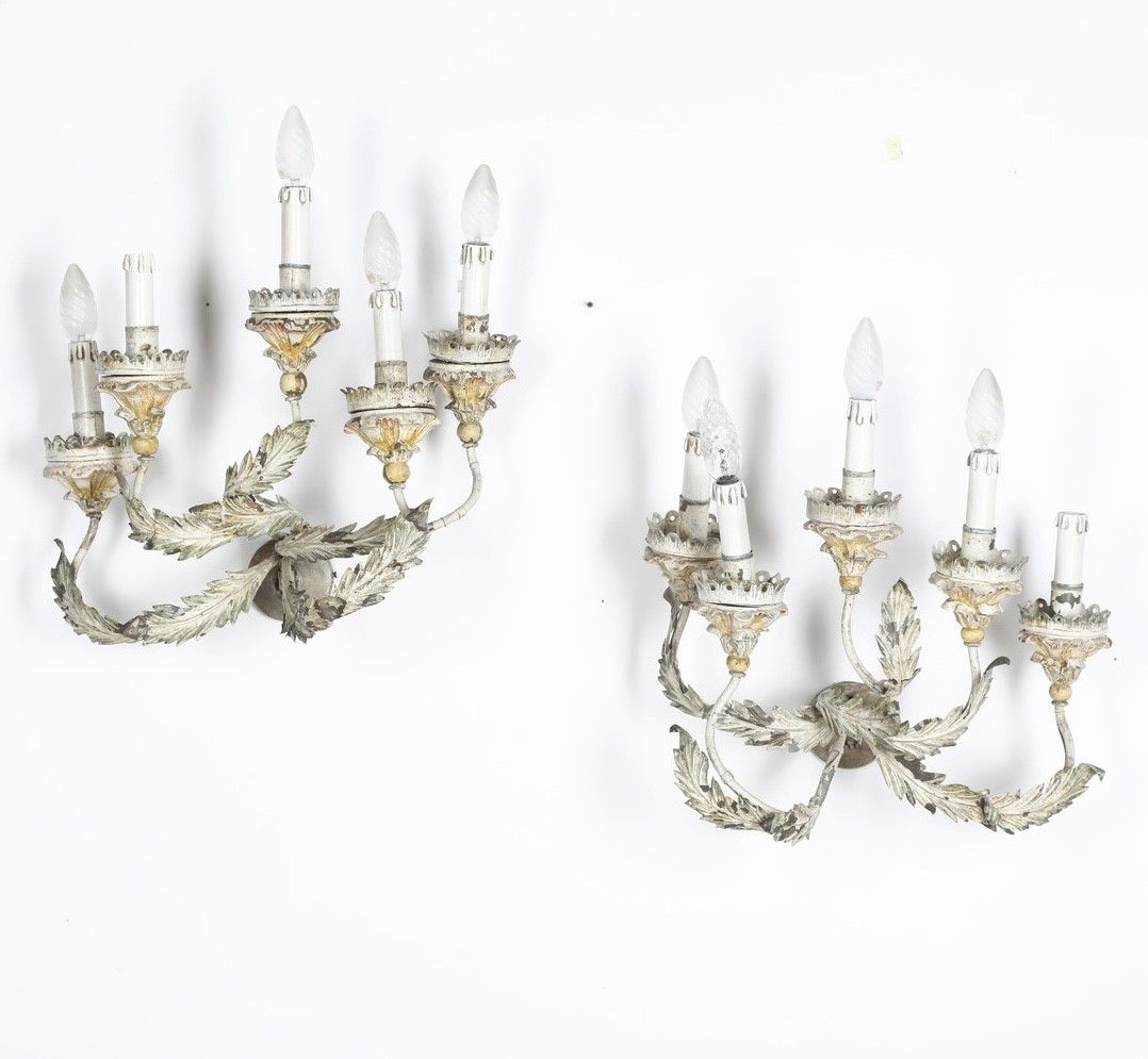 Coppia di appliques a cinque bracci in lamierino dipinto
