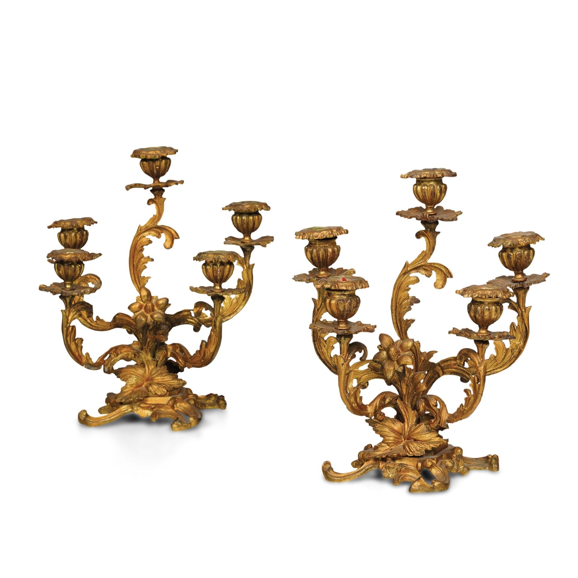 Coppia di candelabri a cinque fiamme in metallo dorato