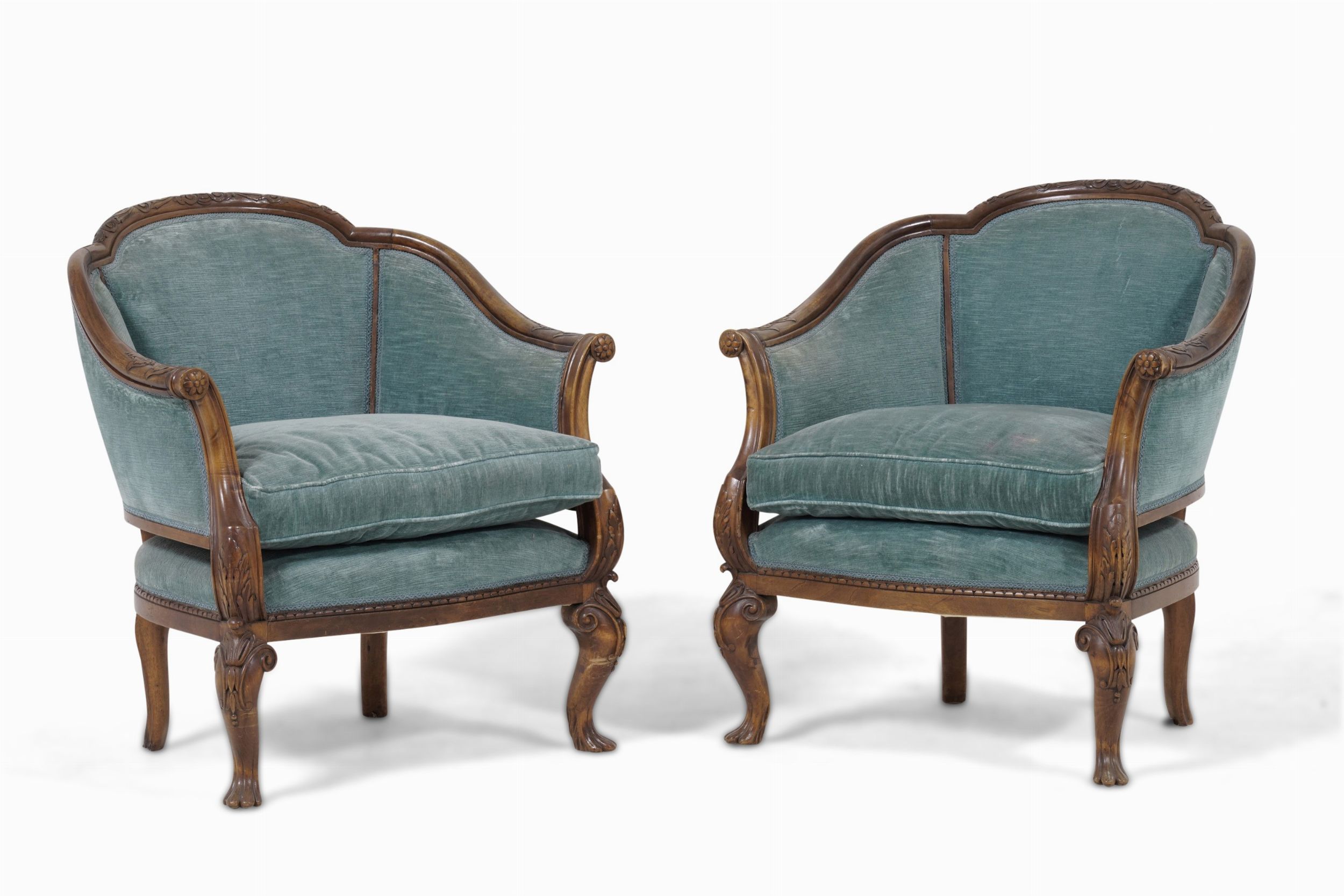 Coppia di poltrone stile a pozzetto in legno intagliato e rivestite con tessuto [..]
