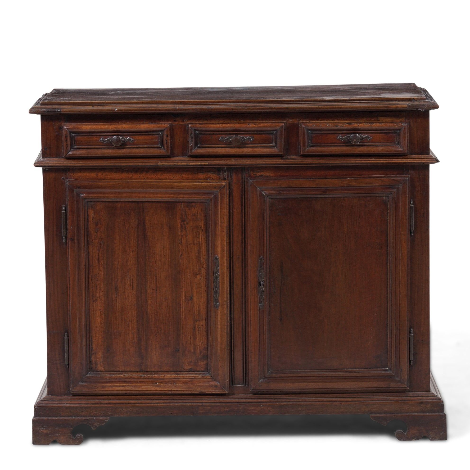 Credenza in noce, due ante pannellate e tre cassetti sottopiano. XVIII secolo