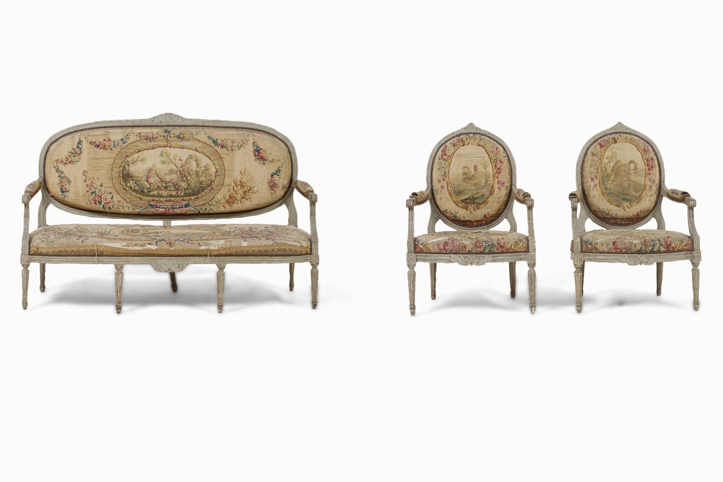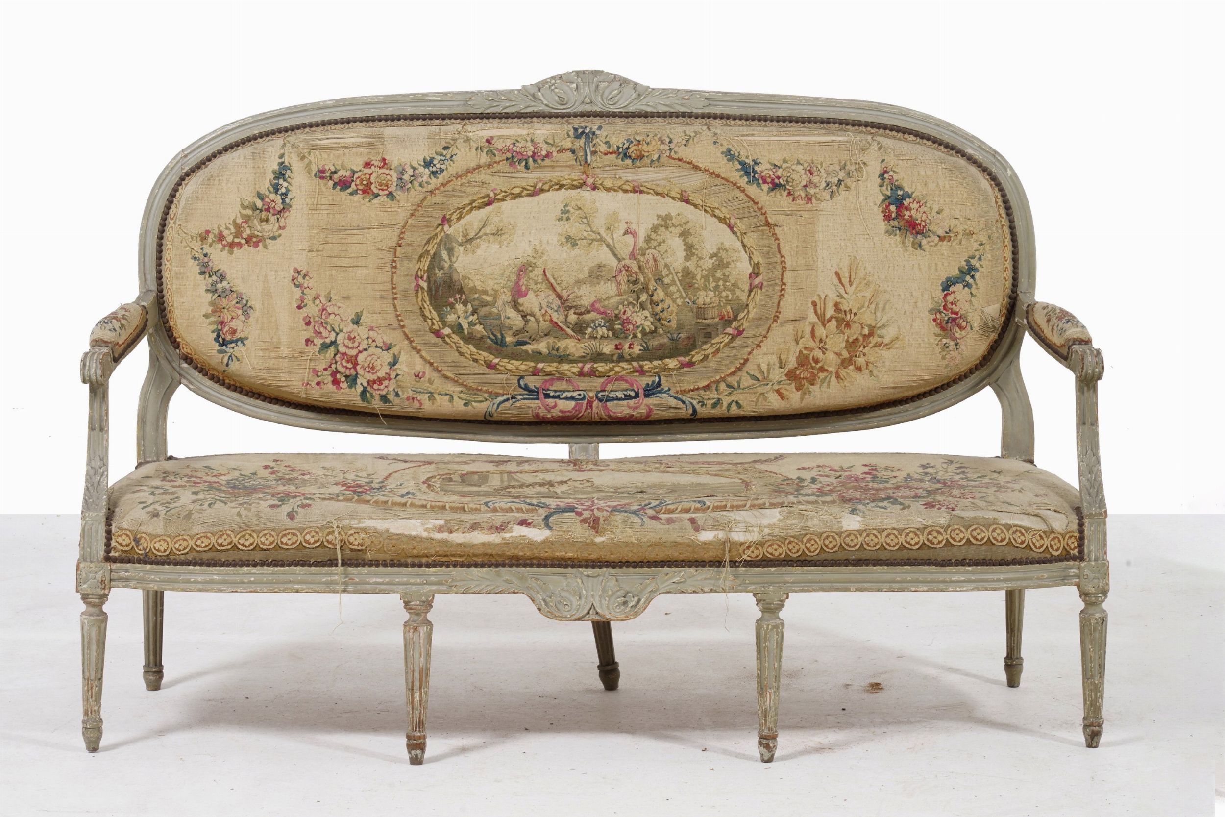 Fornitura da salotto in legno intagliato e laccato, composta da divano e coppia [..]