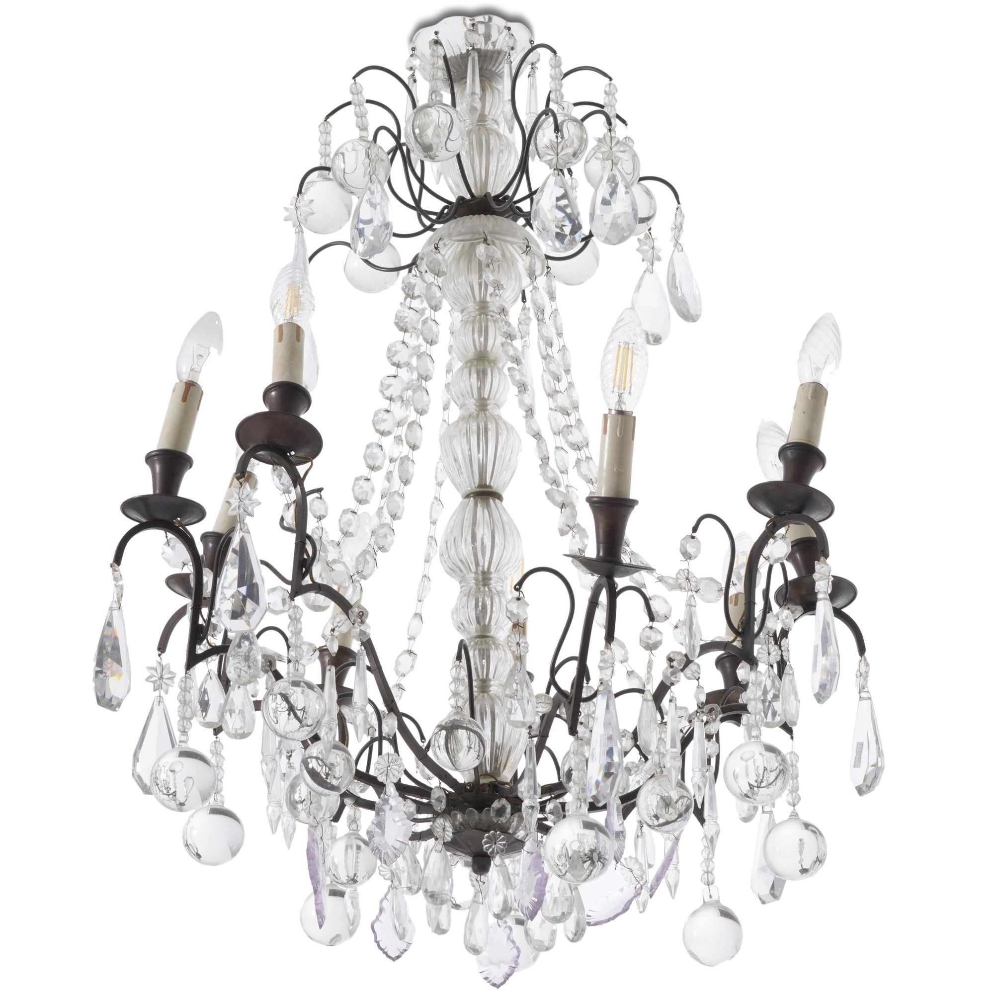 Lampadario con fusto vetro e nove bracci in metallo. XX secolo