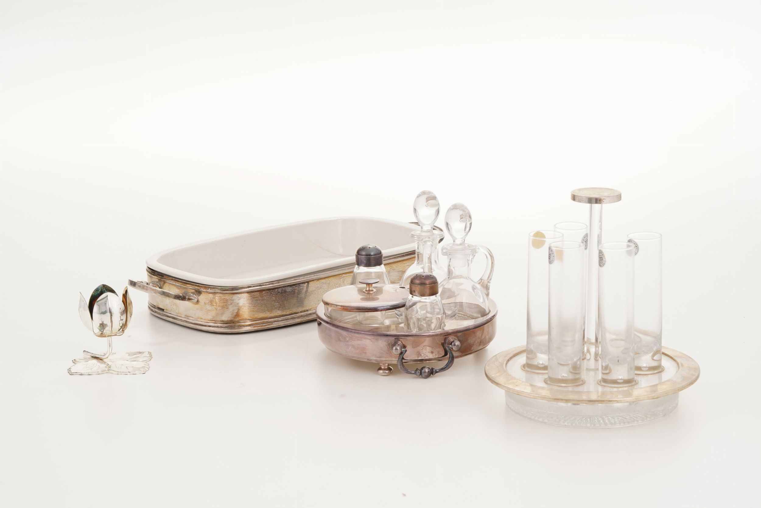 Lotto di oggetti in metallo argentato e vetro