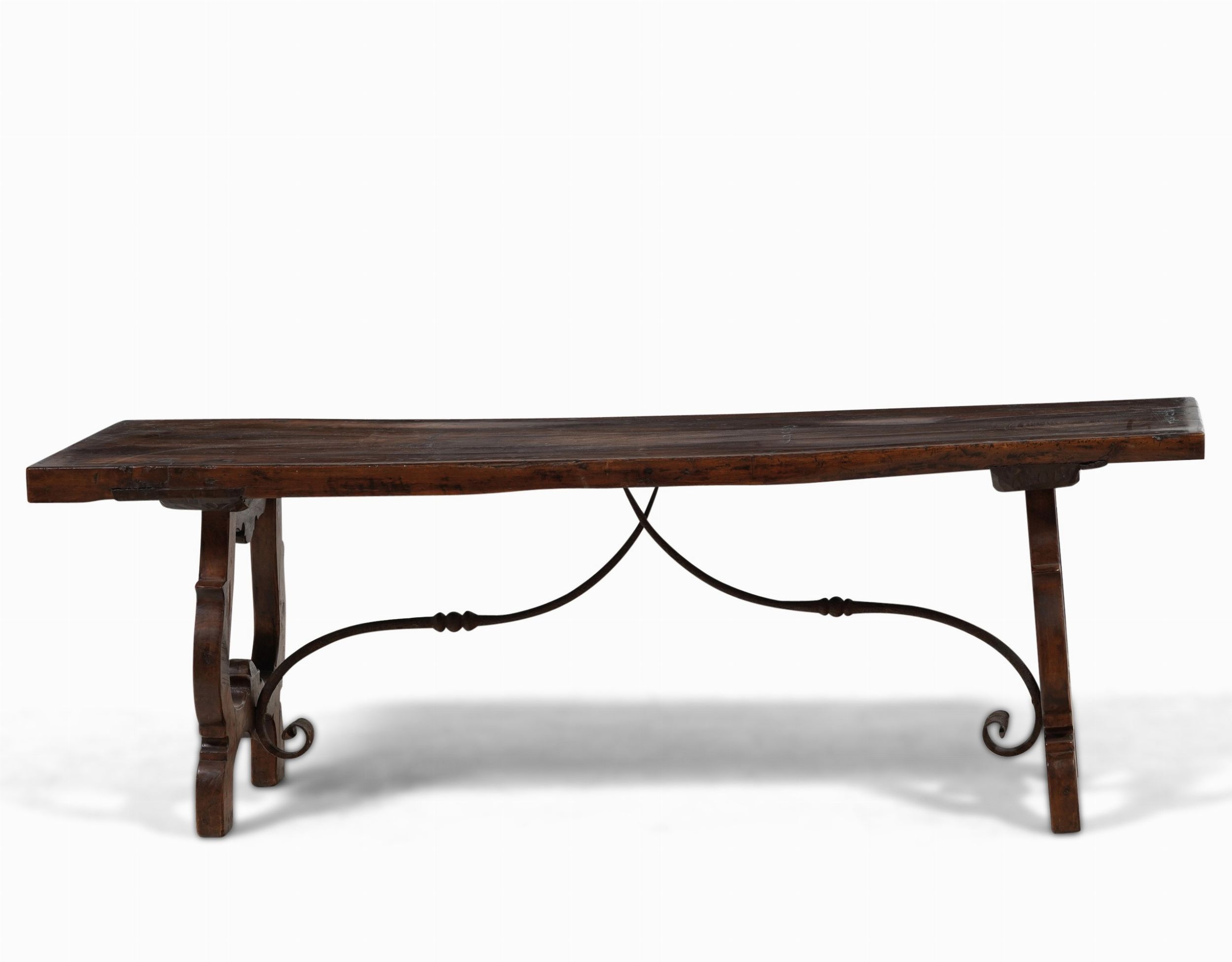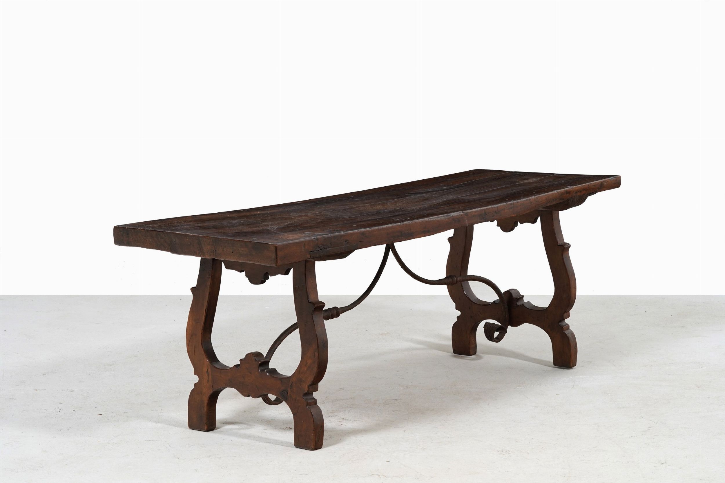 Tavolo con gambe a lira e traverse in ferro battuto. XVIII secolo