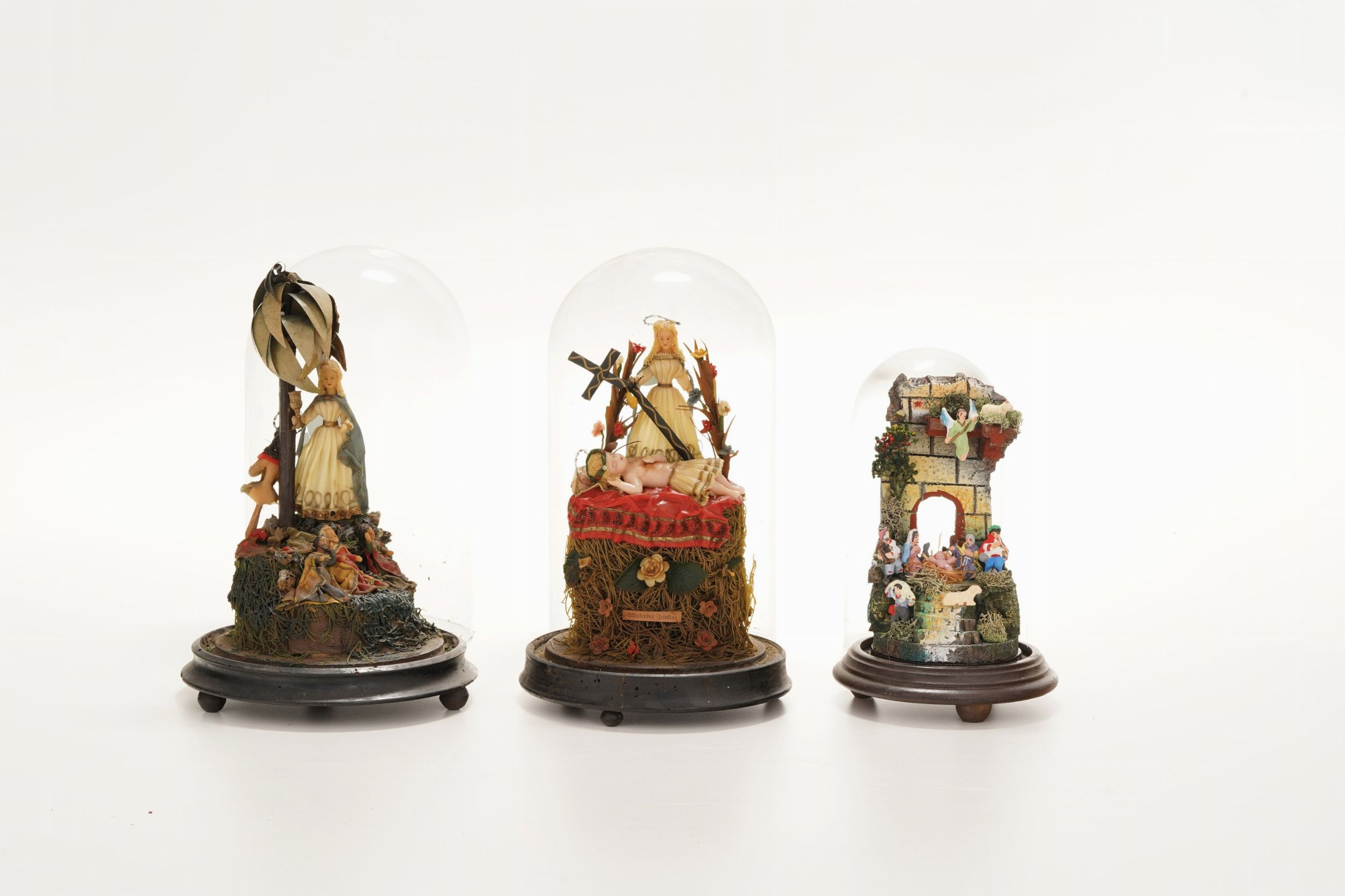 Tre gruppi da presepe in teca di legno e vetro. XX secolo