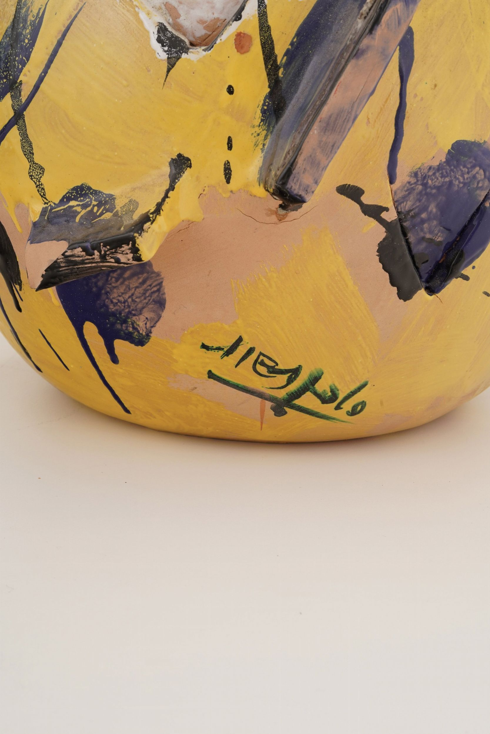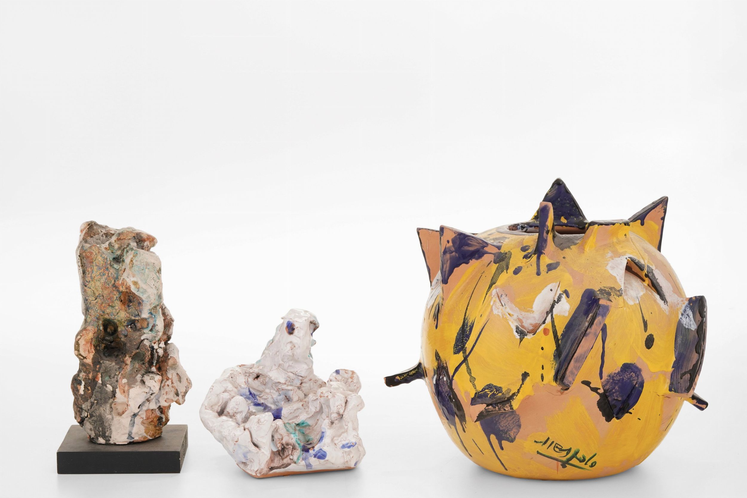 Tre sculture in terracotta dipinta, una firmata Nespolo