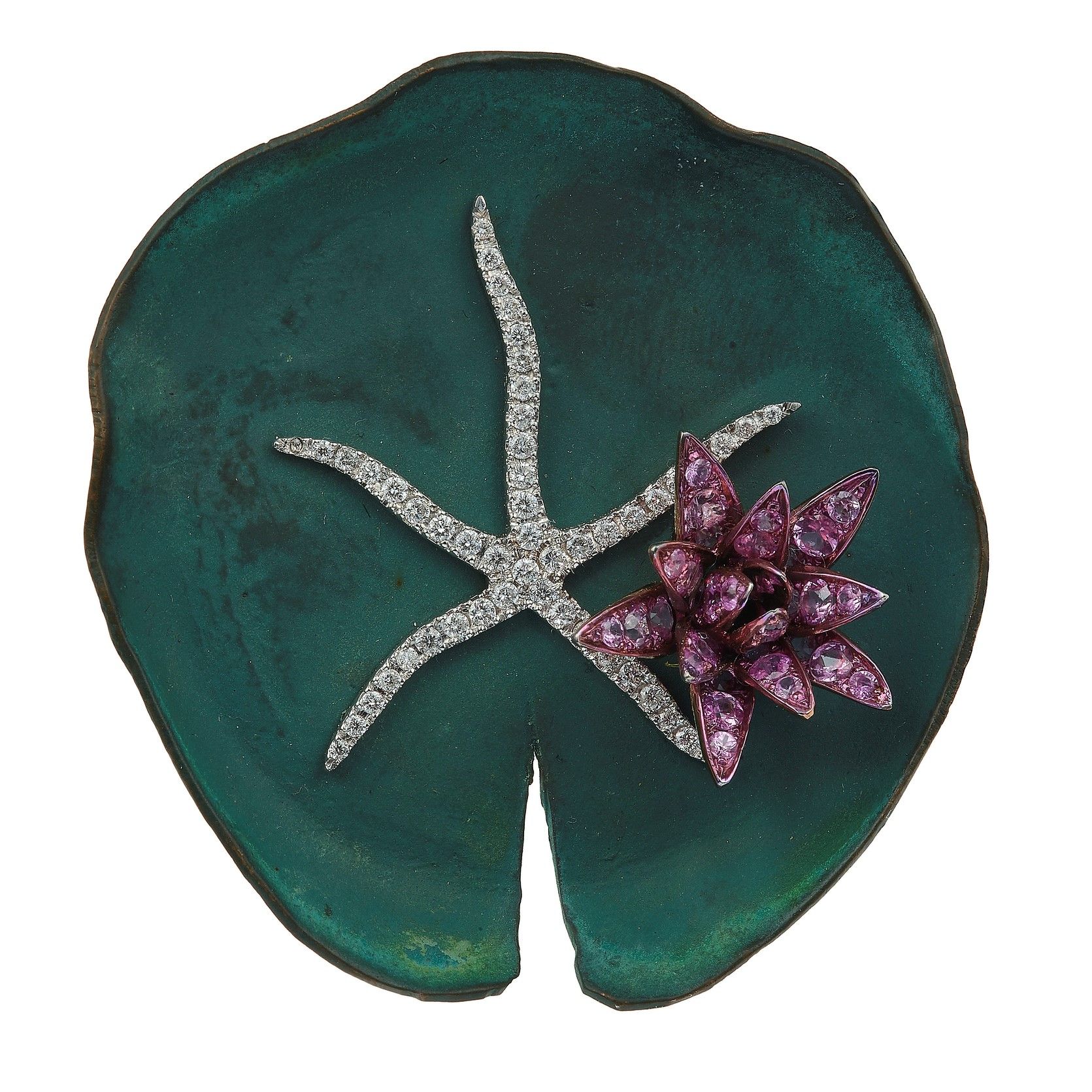 Fabio Salini. Orecchino spaiato Ninfea, smalto, diamanti e zaffiri rosa