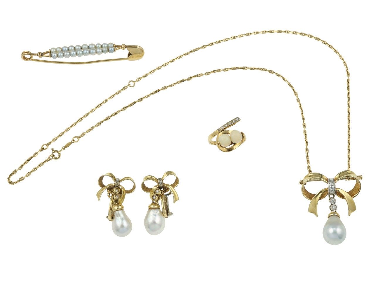 Lotto composto da un girocollo, un paio di orecchini, una spilla ed un anello con [..]