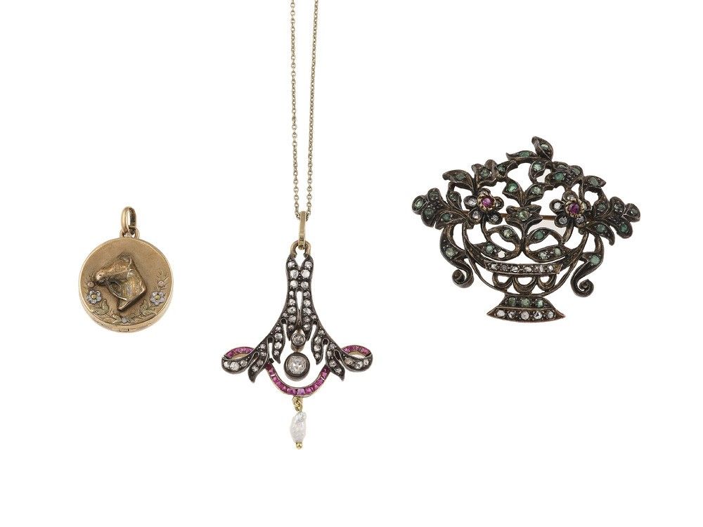 Lotto composto da una spilla e due pendenti con diamanti di vecchio taglio, rubini [..]